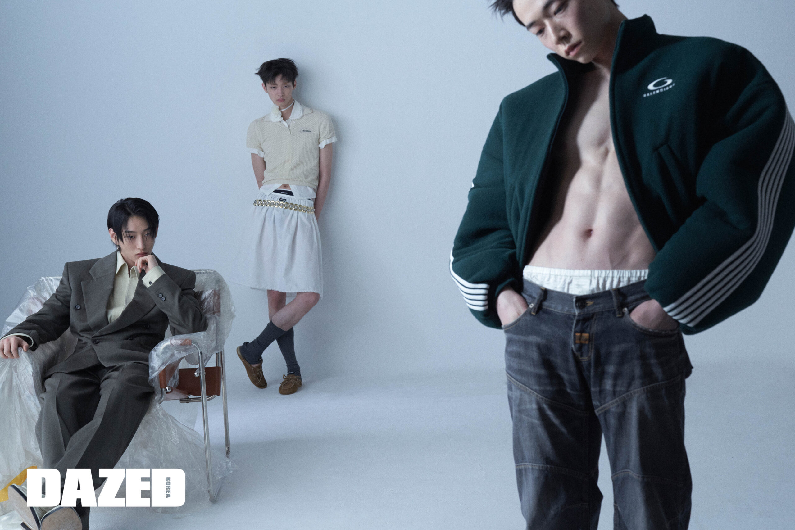 하민이 입은 재킷과 팬츠 셋업, 셔츠, 인트레치아토 위빙 디테일의 대디 로퍼는 모두 보테가 베네타(Bottega Veneta), 이어링은 하민의 것. 밍하오가 입은 베이지 코튼 톱과 화이트 포플린 셔츠, 미디스커트, 브리프, 스웨이드 뮬, 벨트, 그레이 삭스는 모두 미우미우(Miu Miu), 네크리스로 연출한 플라워 브로치는 셀린느(Celine). 료타가 입은 라운드 집업 재킷과 피티드 로웨이스트 팬츠는 발렌시아가(Balenciaga), 화이트 브리프는 에디터의 것.