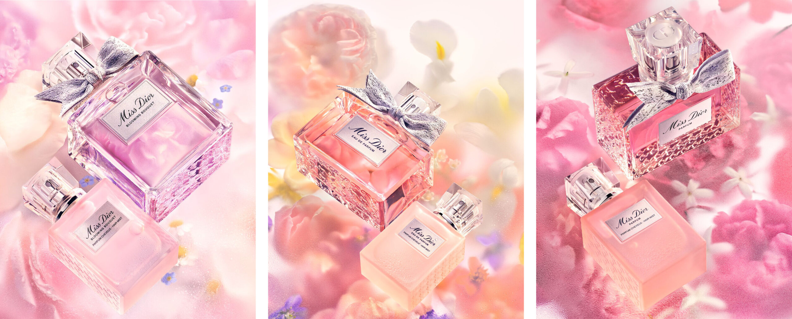 꾸뛰르 케이스와 향수 리추얼을 사용한 미스 디올 블루밍 쿠베 오 드 뚜왈렛, 미스 디올 오 드 퍼퓸, 미스 디올 퍼퓸 모두 크리스챤 디올 퍼퓸(Christian Dior Parfums).