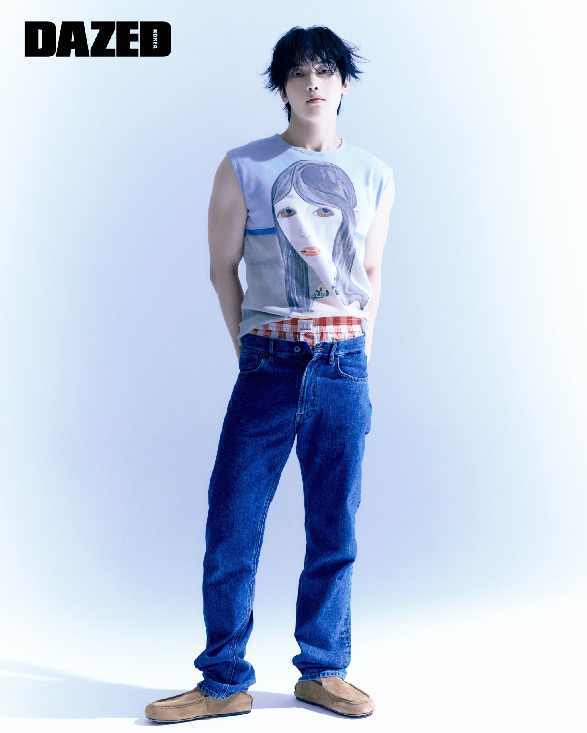 포켓 데님 팬츠와 카프스킨 드라이빙 슈즈는 토즈(Tod’s), 브리프는 ERL by 모스(ERL by MOTH), 톱은 에디터의 것, 이어링은 매튜의 것.