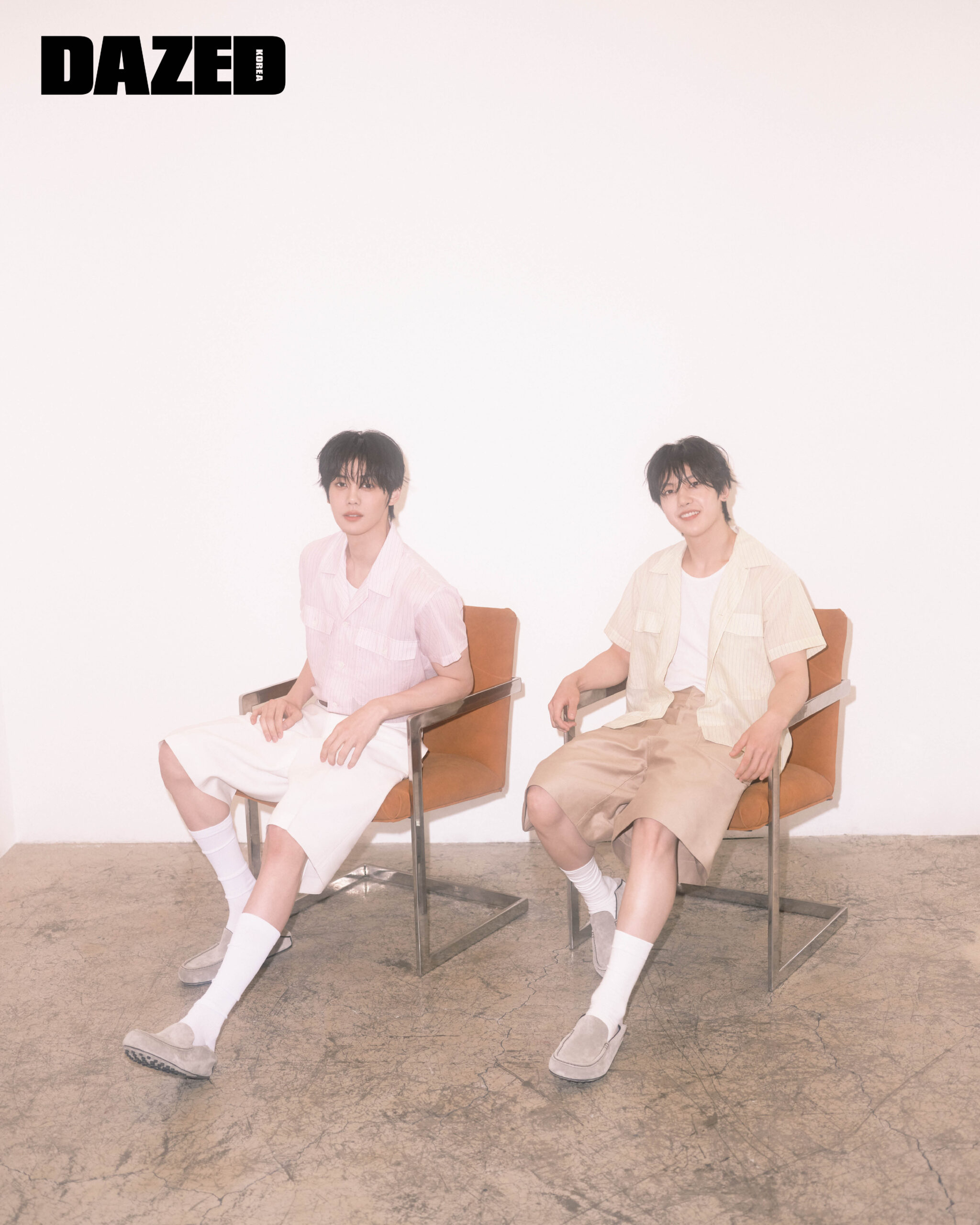 규빈이 신은 카프스킨 스웨이드 소재의 그레이 글로브 고미노 슈즈와 벨트는 토즈(Tod’s), 스트라이프 핑크 셔츠는 세컨드 레이어 by 모스(Second Layer by MOTH), 슬리브리스 톱과 쇼츠, 삭스는 모두 에디터의 것. 매튜가 신은 카프스킨 스웨이드 소재의 그레이 글로브 고미노 슈즈는 토즈(Tod’s), 스트라이프 옐로 셔츠는 세컨드 레이어 by 모스(Second Layer by MOTH), 팬츠는 맥퀸 by 모스(McQueen by MOTH), 슬리브리스 톱과 삭스는 에디터의 것, 이어링은 매튜의 것.