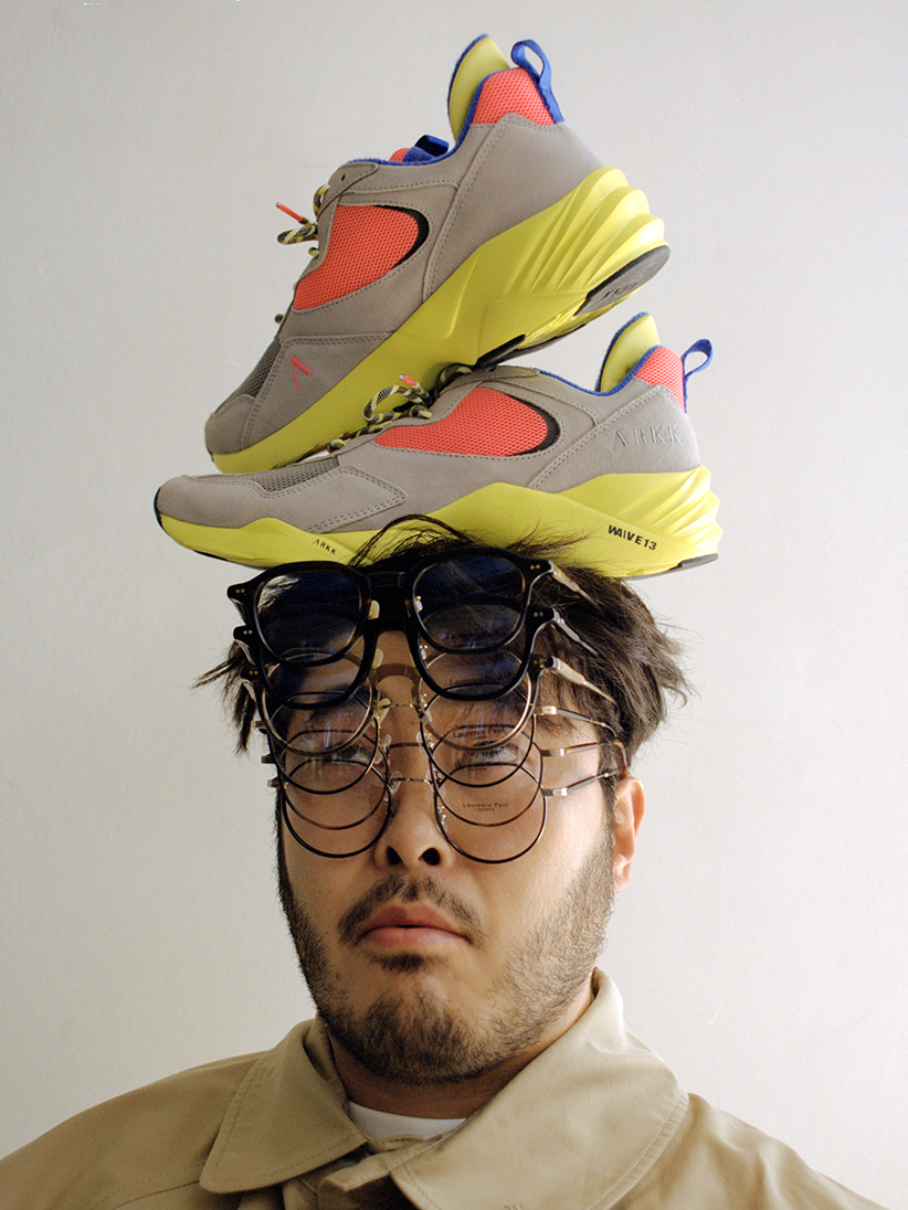 블루 깅엄체크 재킷은 타이가 타카하시(Taiga Takahashi), 블랙 톱은 세이모우(Ceimou), 하프 팬츠는 오픈와이와이(Open YY).
