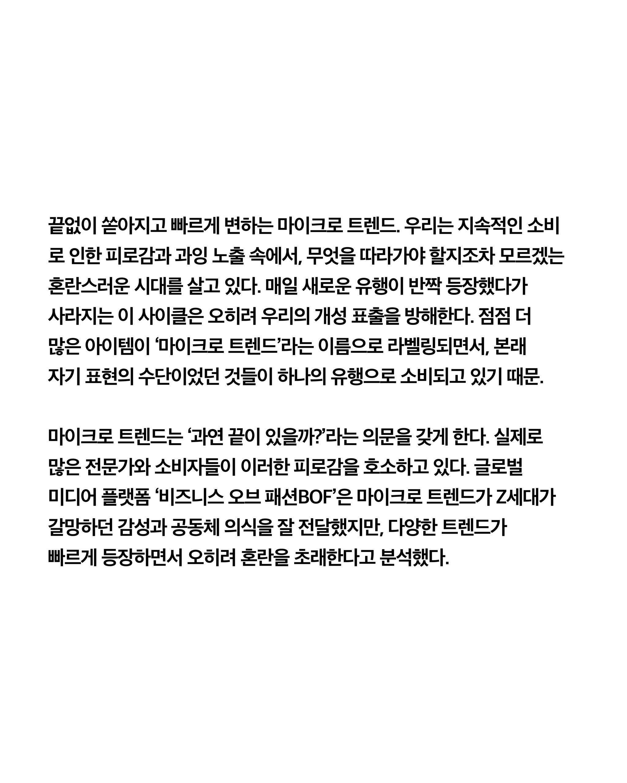 끝없이 쏟아지고 빠르게 변하는 마이크로 트렌드. 우리는 지속적인 소비로 인한 피로감과 과잉 노출 속에서 이제 무엇을 따라가야 할지조차 혼란스러운 시대를 살고 있다. 매일 새로운 유행이 반짝 등장했다가 사라지는 이 사이클은 오히려 우리의 개성 표출을 방해한다. 점점 더 많은 아이템이 ‘마이크로 트렌드’라는 이름으로 라벨링되면서, 본래 자기 표현의 수단이었던 것들이 또 하나의 유행으로 소비되고 있기 때문이다.