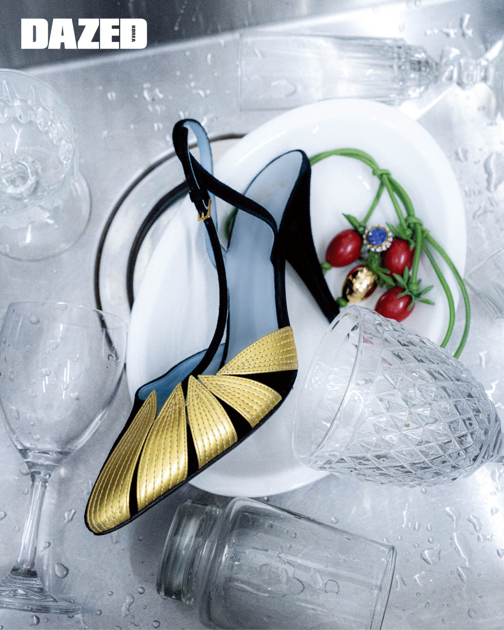 골드 리프 모티브의 폴리폴리아주 슬링백 펌프스와 크리스털을 세팅한 브이 로고 펄 링은 발렌티노 가라바니(Valentino Garavani), 토마토 줄기를 형상화한 카프스킨 참은 로에베(Loewe).