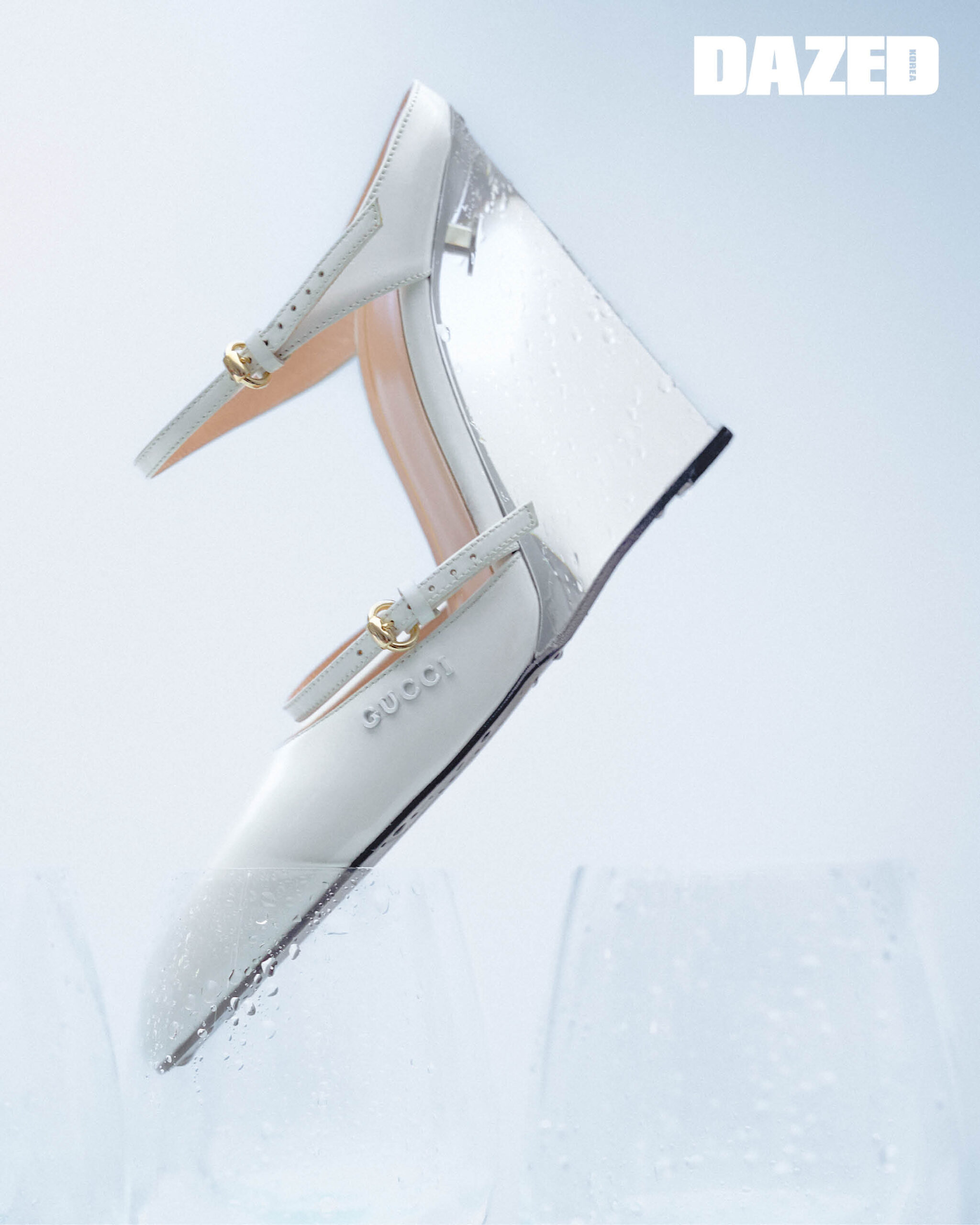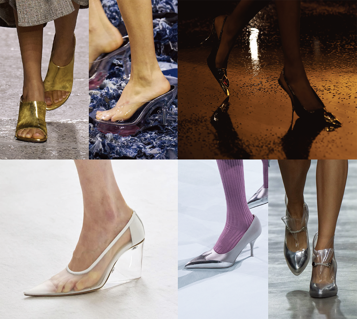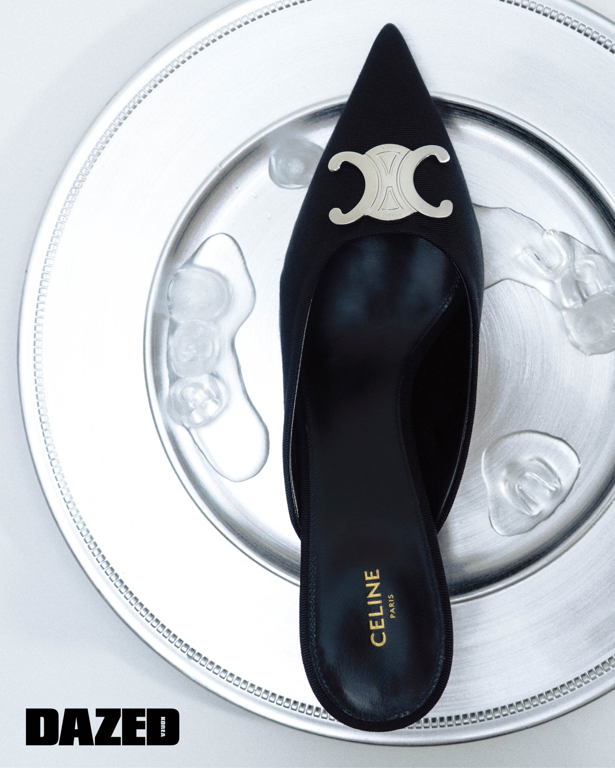 놀랍게도 다수의 2025년 봄/여름 컬렉션은 내 편협한 관점을 깨뜨렸다. 촉촉한 감각을 정면으로 끌어안으며 패션의 언어로 승화했다. 이번 시즌, 런웨이 위에서 이 물성을 가장 잘 표현한 아이템은 글로시한 뾰족구두. 표면에 반짝이는 조명을 반사하며 물살을 가르듯 걸어 나오는 순간에 본능적으로 시선이 이끌렸다. 촉촉한 공기가 감도는 밤거리를 닮은 쇼장을 거침없이 가로지르는 생로랑의 스틸레토 힐은 ‘웨트 럭셔리wet luxury’라는 개념의 완결이었다. 저 힐을 신으면 왠지 사연 있는 여자가 될 것만 같은 기분이랄까. 물기를 연상시키는 요인에는 소재가 이끄는 분위기도 한몫한다. 프라다와 보테가 베네타의 메탈릭 슈즈는 그 위에 물방울을 똑 떨어뜨리고 싶은 불경한 충동을 자극한다. 스포트막스의 슈즈에 장착된 투명한 웨지는 얼음처럼 맑고 단단했고, 디젤의 PVC 힐은 곧 다가올 장마철에도 끄떡없겠다는 인상을 남겼다. 라반의 펌프스를 보자 저절로 피식 웃음이 새어 나왔다. 투명한 아크릴로 한 겹 감싼 실루엣이 촬영장에서 혹여 슈즈가 젖을까 비닐로 꽁꽁 싸매던 기억을 상기시켜서. 감정의 끝을 찌르는 듯 날카로운 굽과 물빛처럼 번들거리는 표면 위로 스며드는 불온한 시선. 하우스들은 젖지 말라는 경고 대신 더 깊이 들어가 보라고 부추긴다. 건조함은 더 이상 미덕이 아니다. 광택은 감정의 반사이고, 습기는 균열이며, 그 균열 사이로 흘러나오는 건 무너짐이 아닌 여유다. 멋들어진 슈즈를 신고 감히 물속에 들어서는 용기처럼 걷고, 젖고, 흘리고, 끝내는 그대로 빛나는 것.