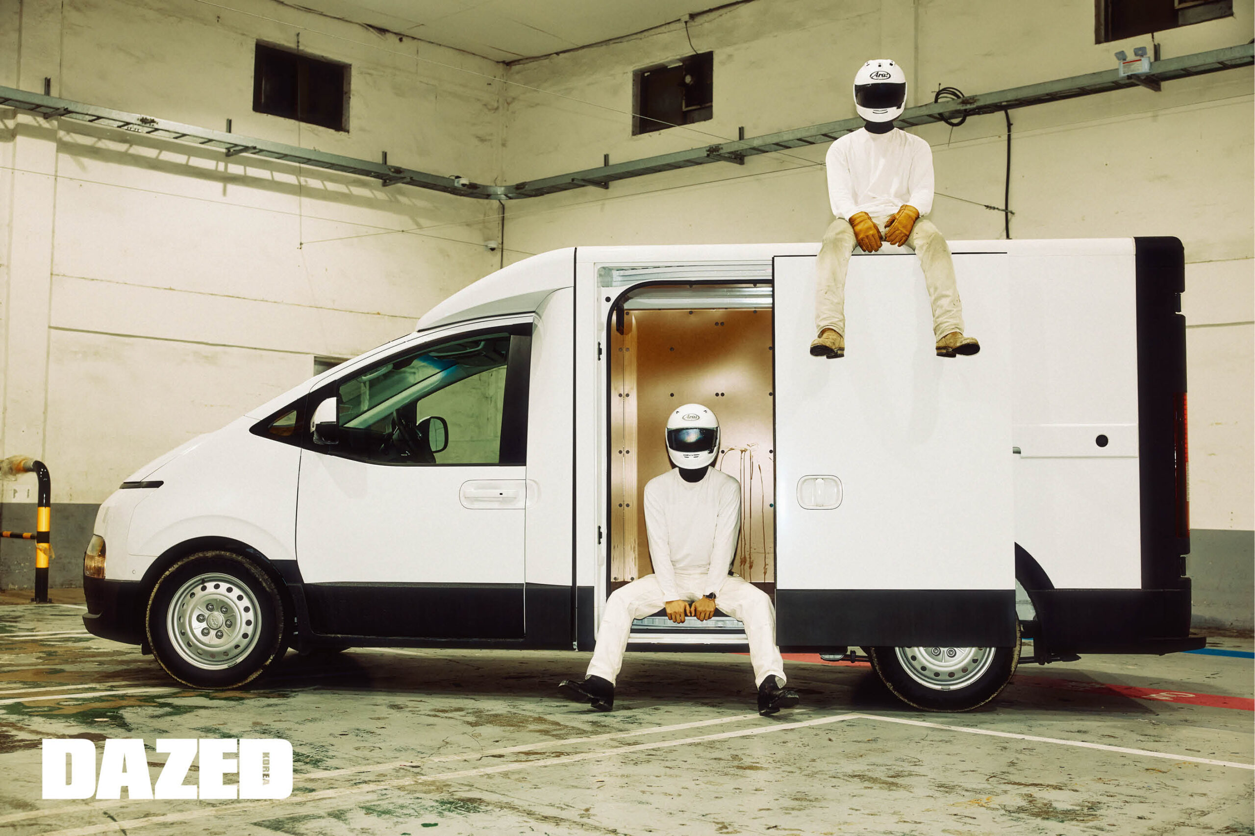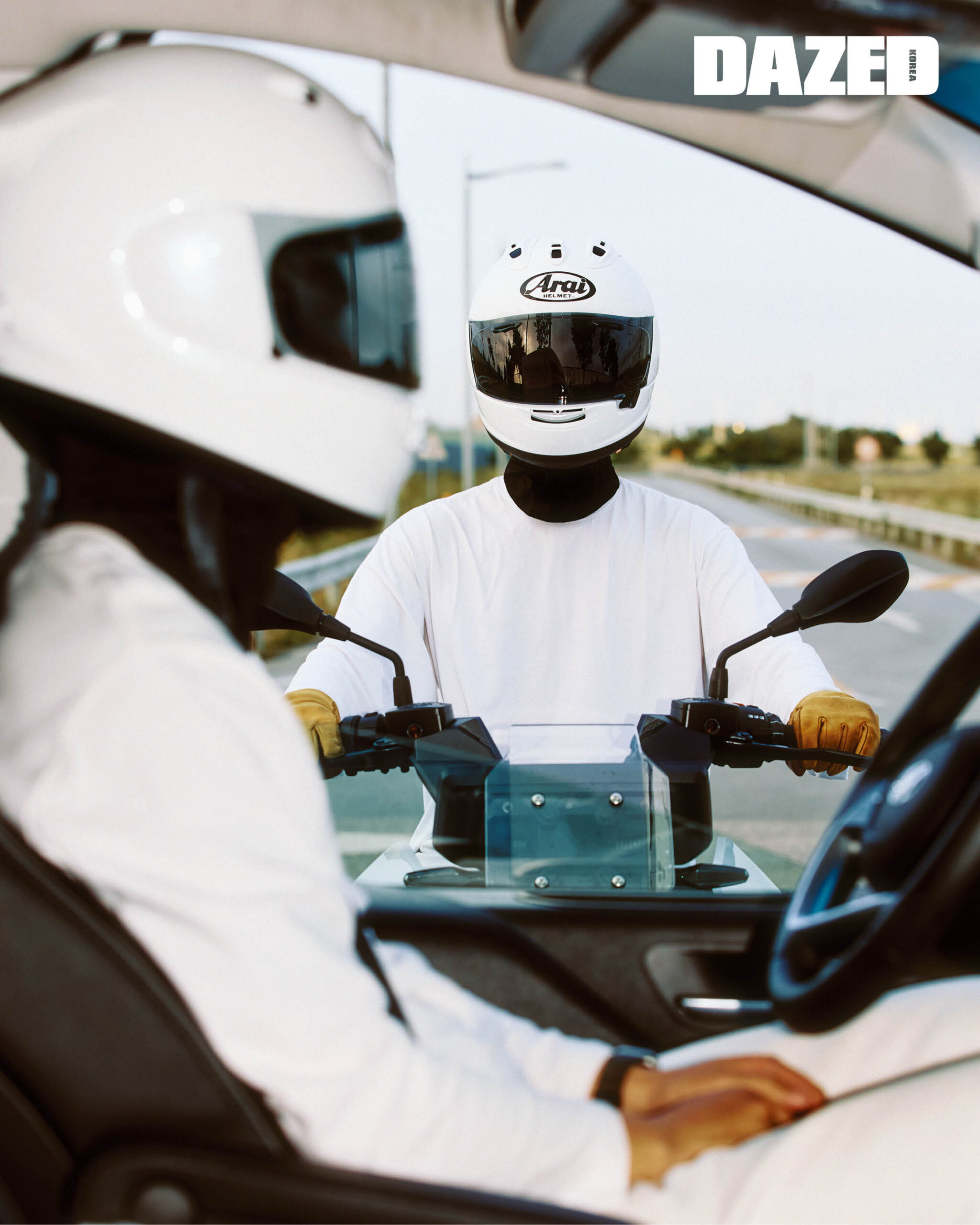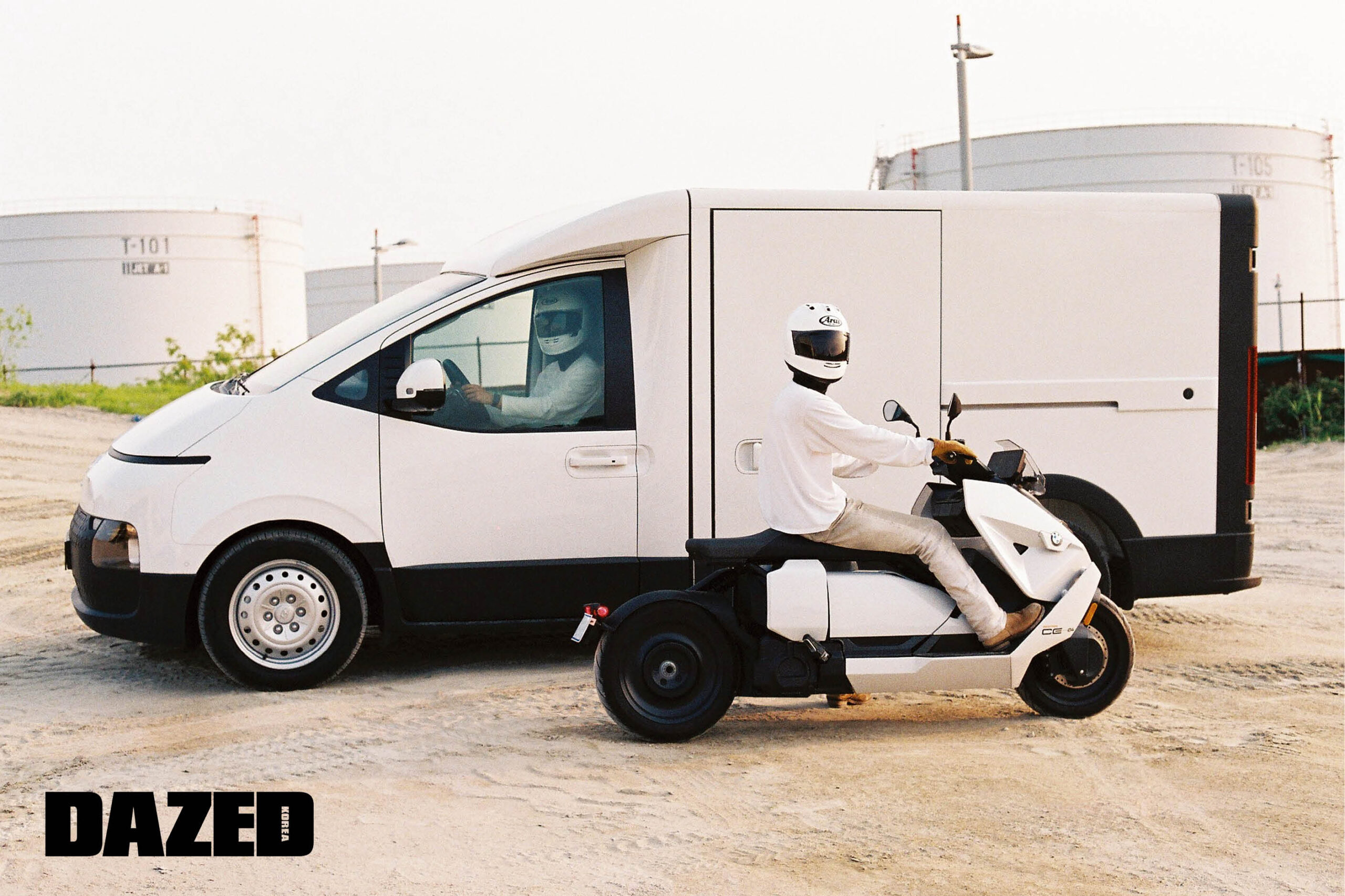 영종도 어딘가에서. 이번 촬영은 패션 에디터 티아와 함께했다. 티아는 아라이 헬멧을 쓰고 현대 ST1 운전석에 앉아 있다.