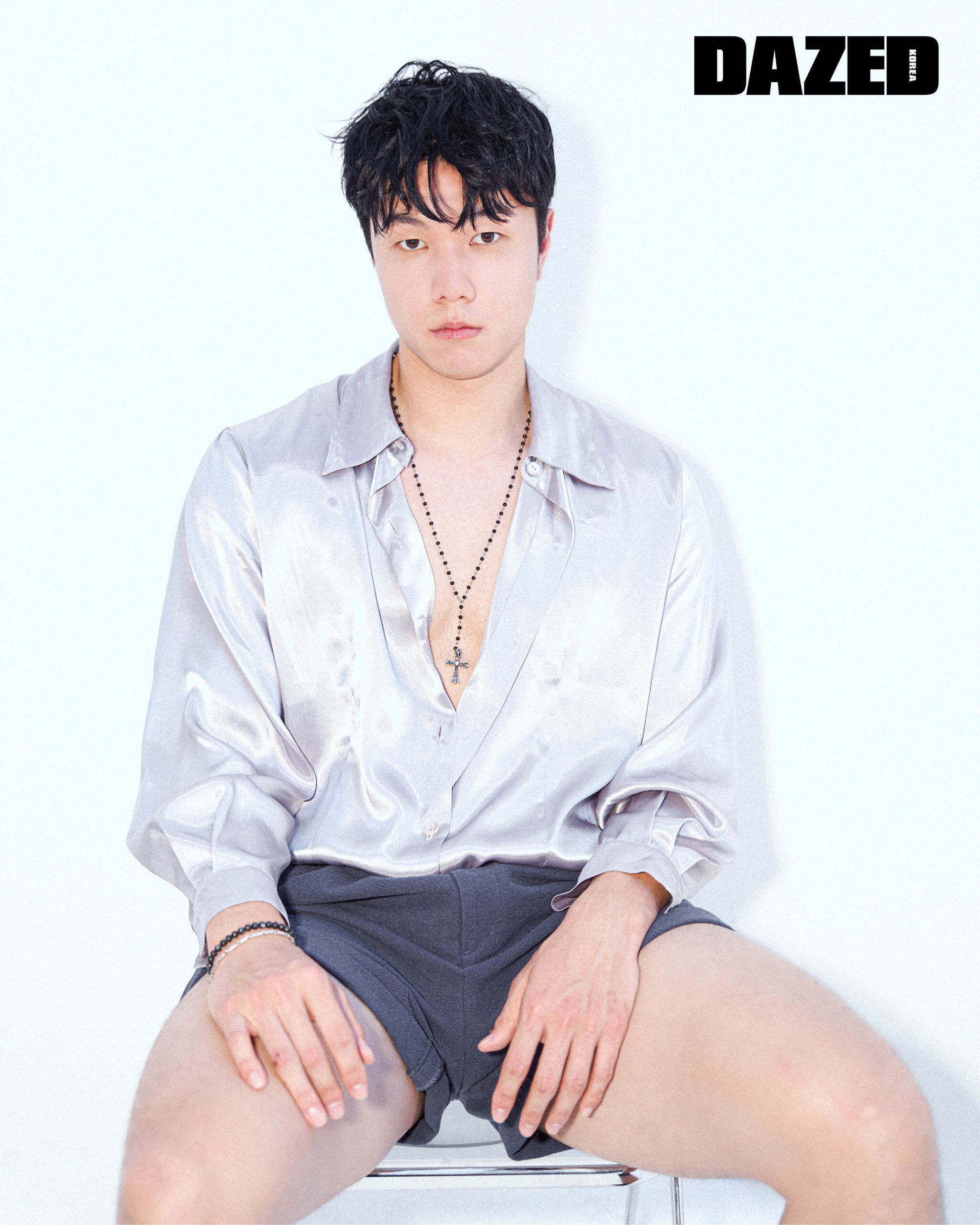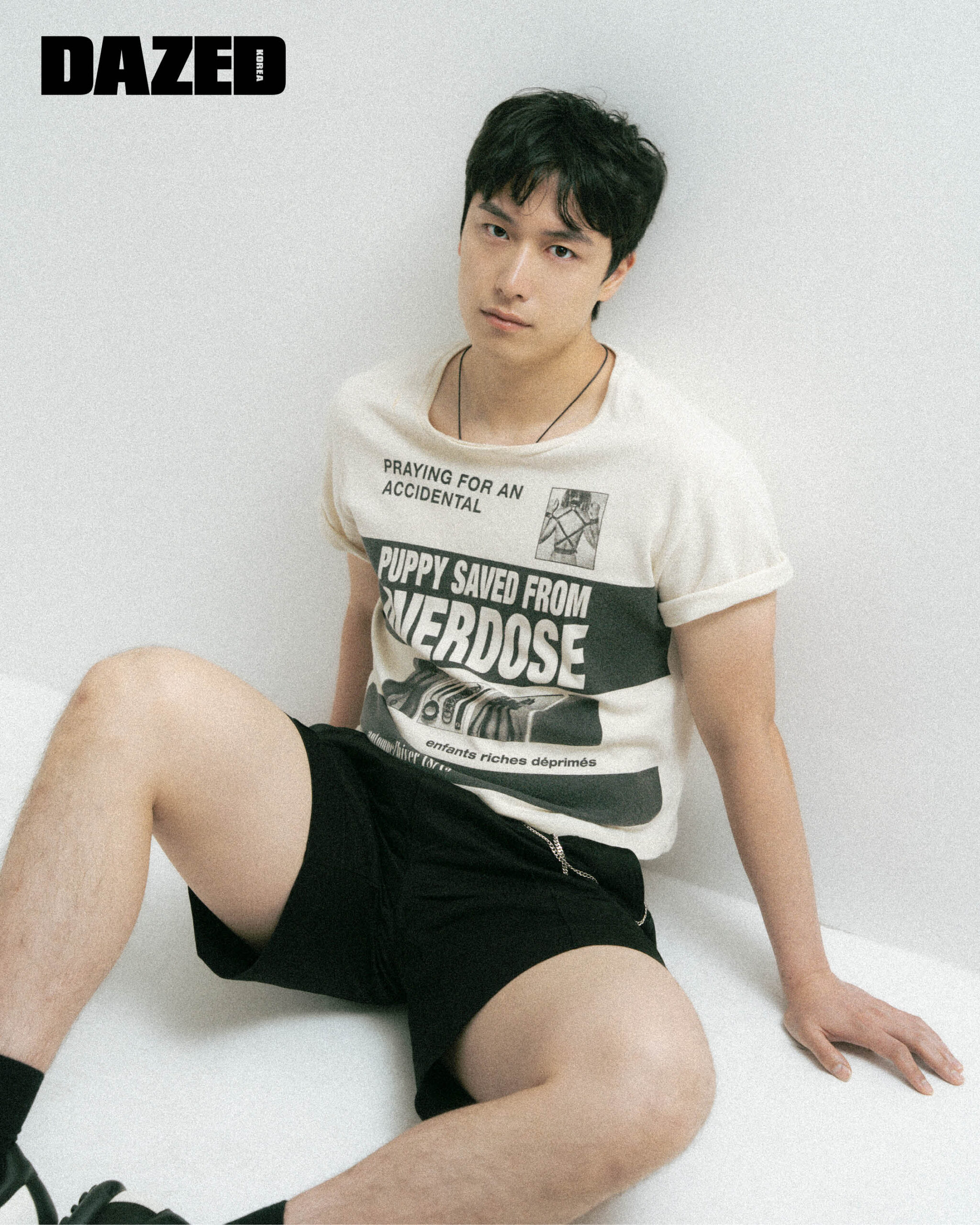 블랙 쇼츠는 맨인정글(Men in Jungle), 스트링 네크리스는 카미긴(Kamigin), 쇼츠에 장식한 실버 체인 네크리스는 톰 우드(Tom Wood), 그래픽 티셔츠는 에디터의 것.