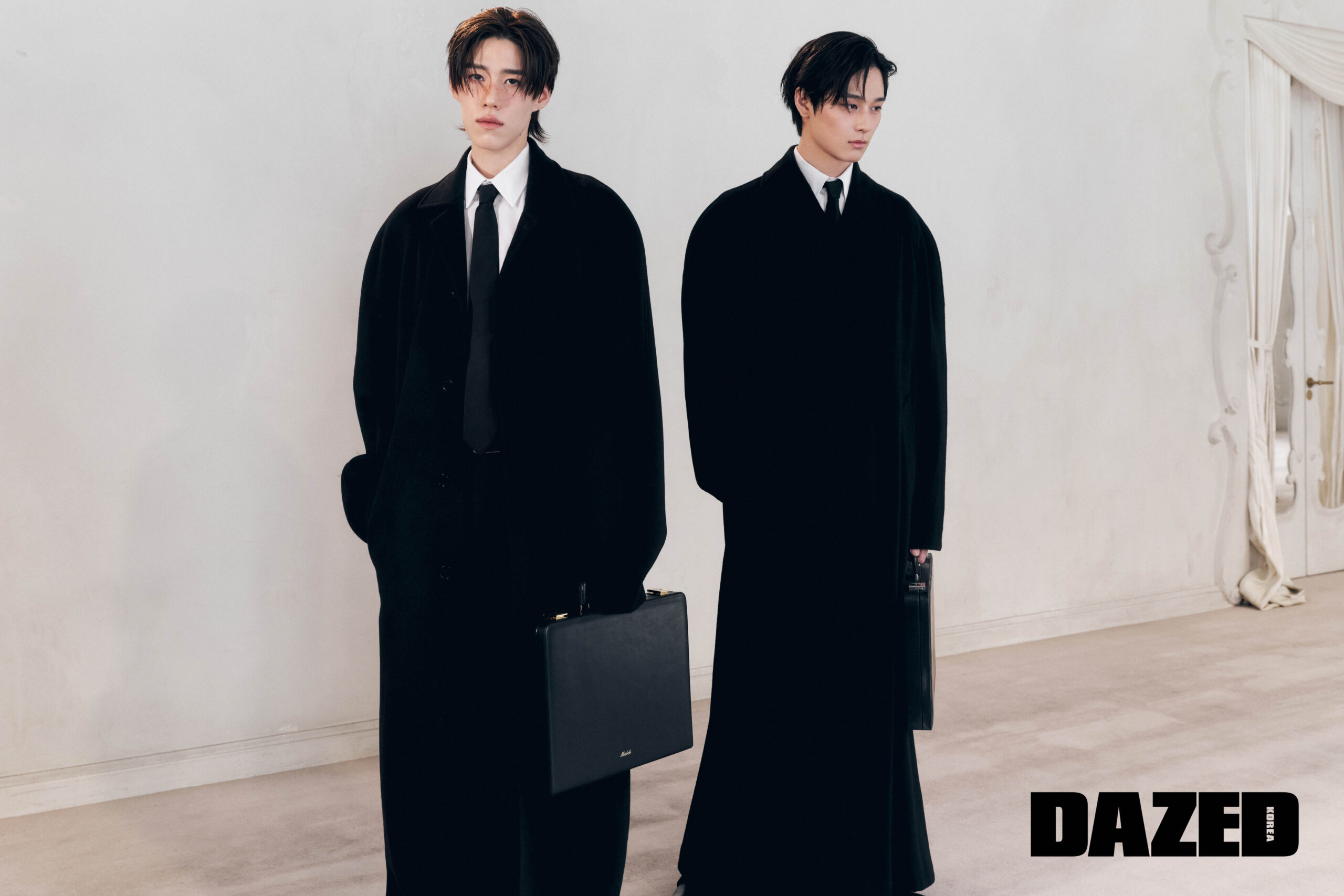 블랙 래글런 코트와 화이트 스몰 핏 셔츠, 블랙 트라우저, 슈즈, 블랙 타이, 백은 모두 발렌시아가 54번째 쿠튀르(Balenciaga 54th Couture).