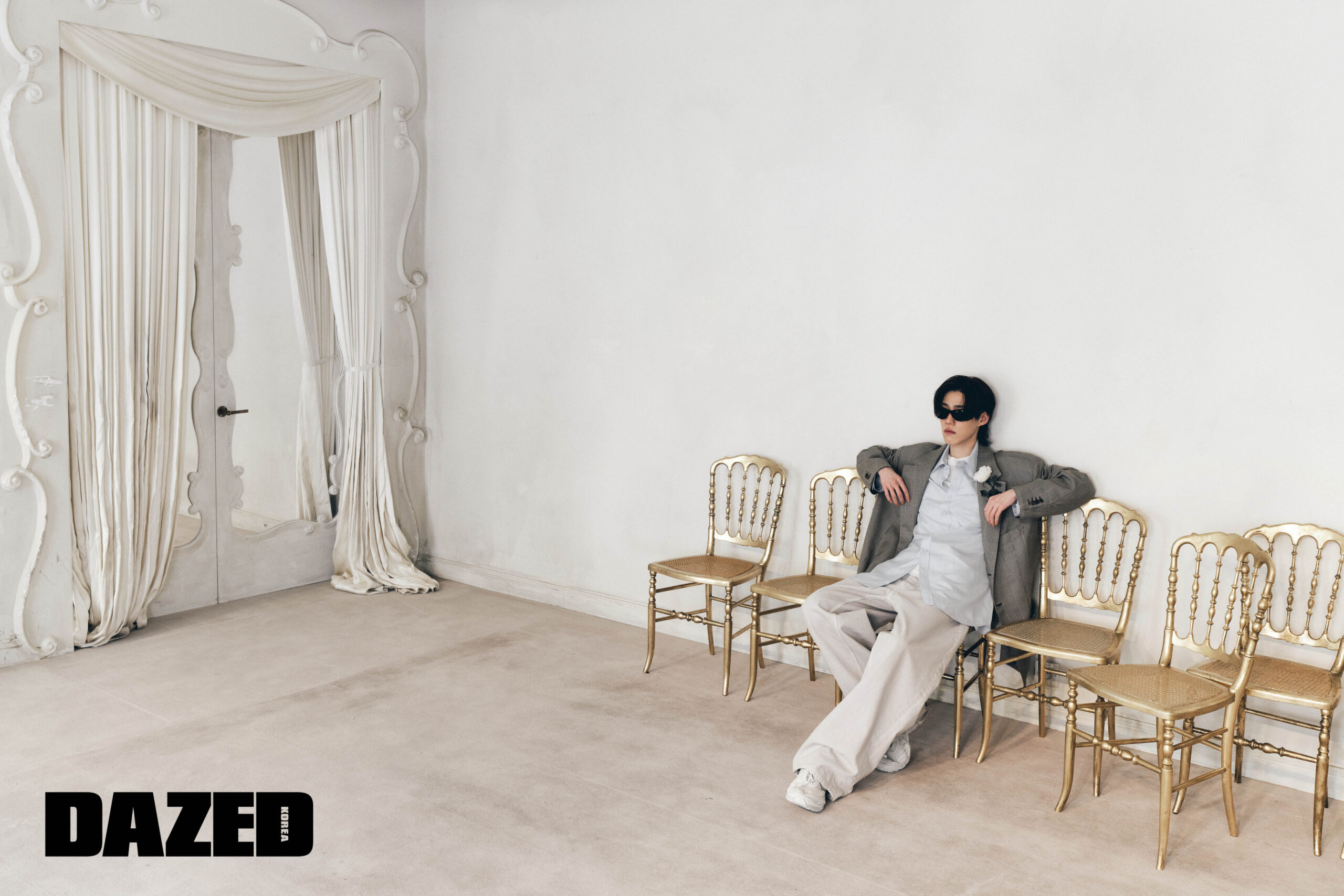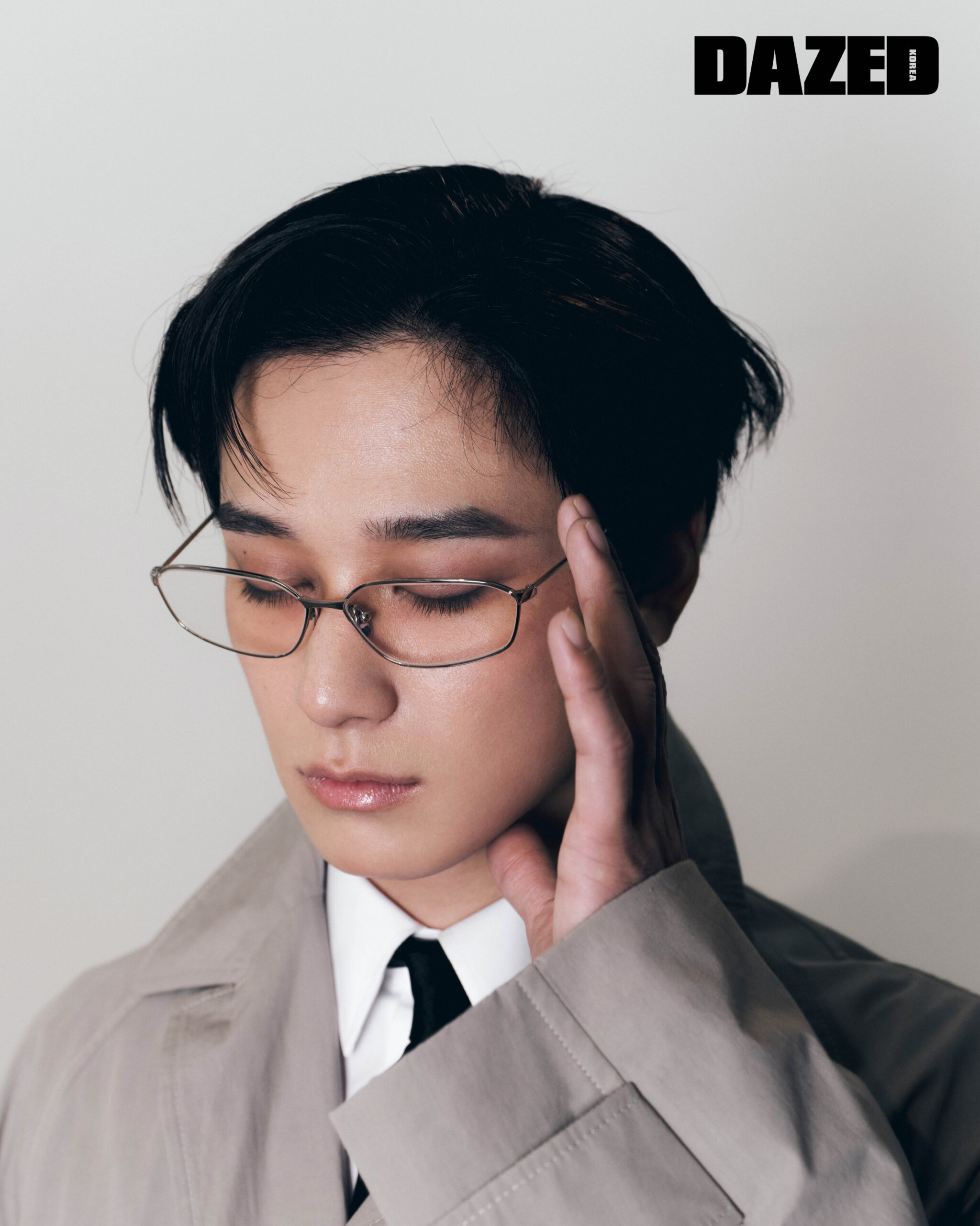 주연이 입은 초크 컬러 카코트와 화이트 슬림 핏 셔츠, 타이, 아이웨어는 모두 발렌시아가 54번째 쿠튀르(Balenciaga 54th Couture).