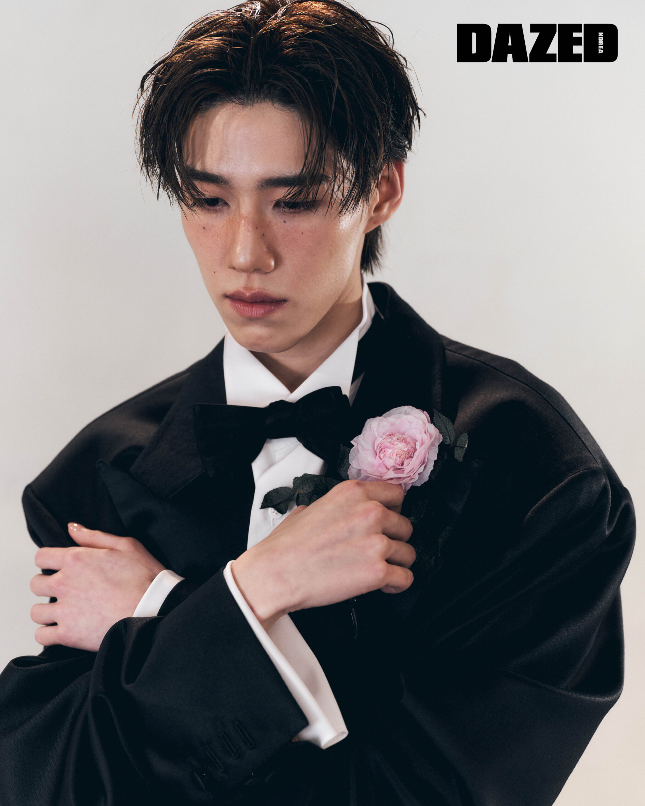 블랙 싱글브레스트 라지 핏 재킷과 화이트 라지 핏 셔츠, 블랙 보타이는 모두 발렌시아가 54번째 쿠튀르(Balenciaga 54th Couture).