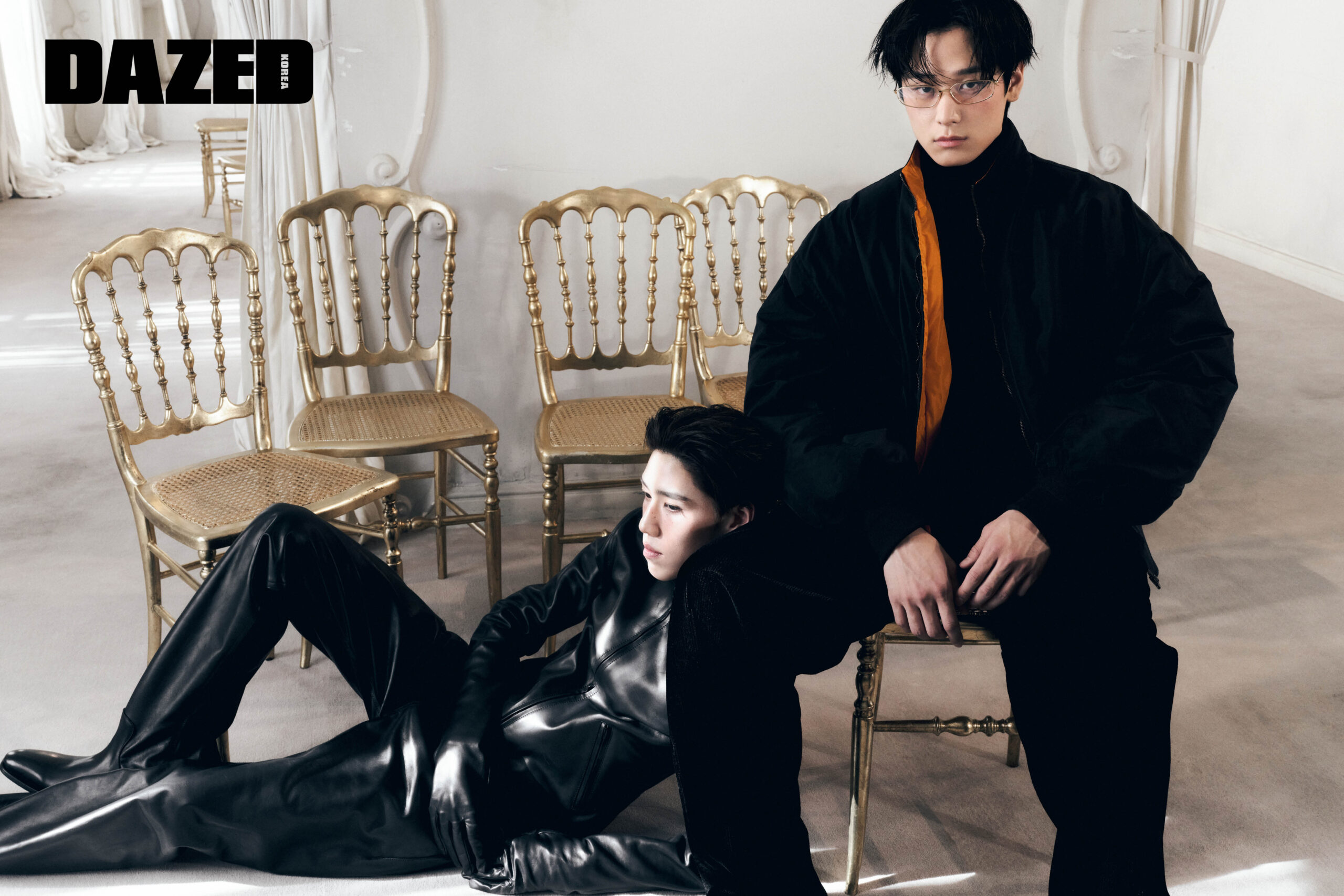 피피가 입은 글러브가 연결된 모터사이클 재킷과 팬타슈즈는 발렌시아가 54번째 쿠튀르(Balenciaga 54th Couture). 주연이 입은 블랙 보머 재킷과 터틀넥, 코듀로이 팬츠는 모두 발렌시아가 54번째 쿠튀르(Balenciaga 54th Couture).