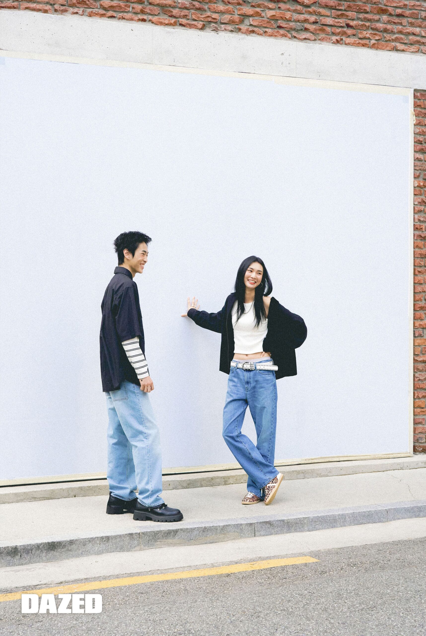 현준이 입은 크루넥 티셔츠와 와이드 스트레이트 진, 벨트는 모두 유니클로(UNIQLO). 지연이 입은 스트라이프 립브라탑과 미니 티셔츠, 와이드 스트레이트 진은 모두 유니클로(UNIQLO).