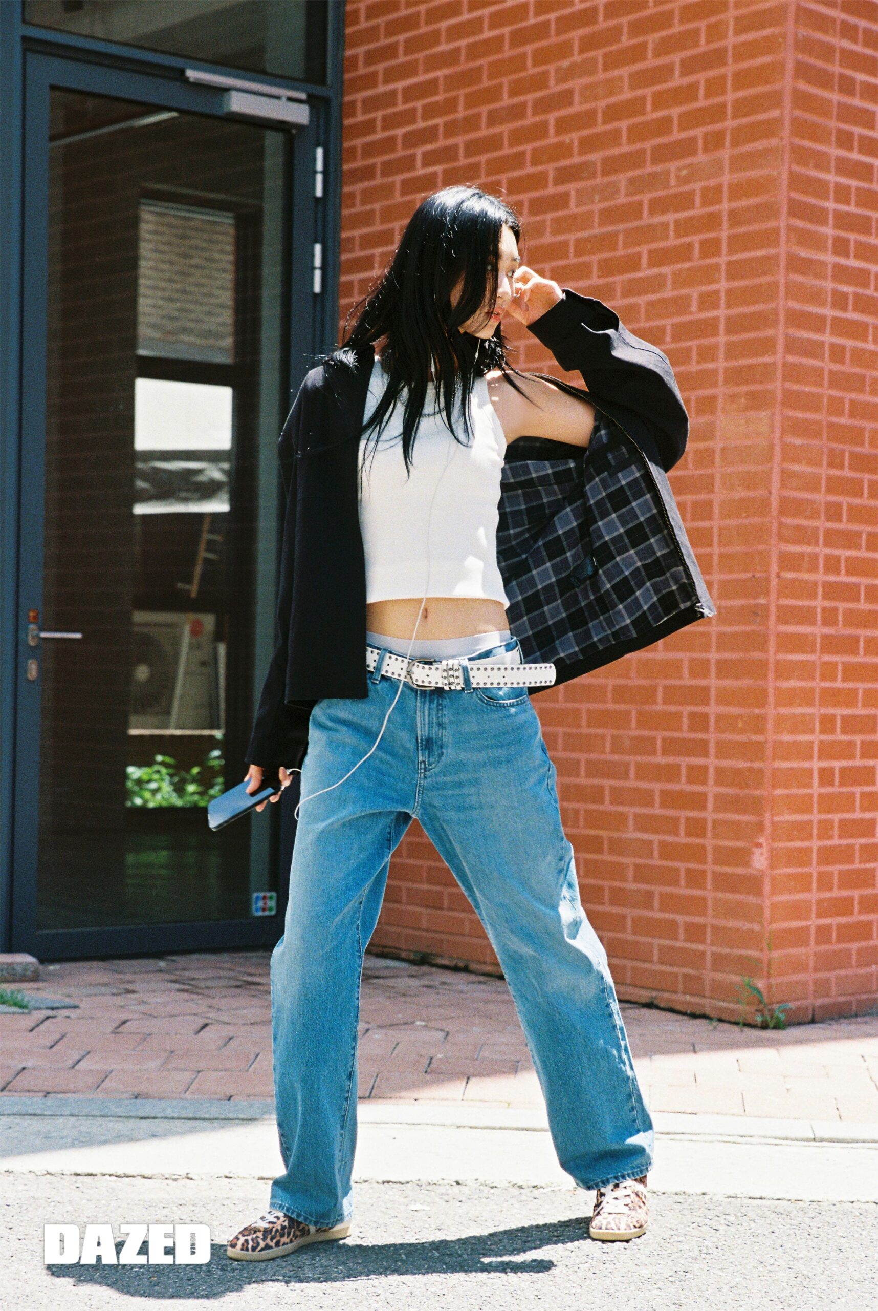집업 쇼트 블루종과 이너로 입은 립브라탑 JW앤더슨 콜라보 스트레이트 진은 모두 유니클로(UNIQLO).