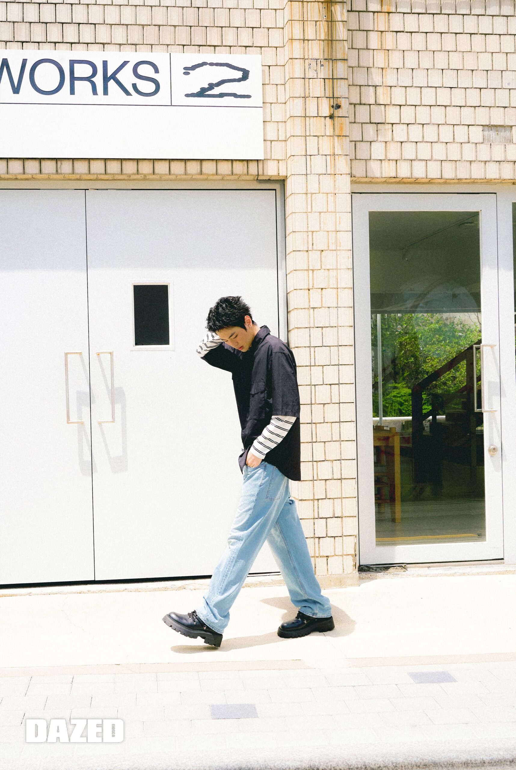 유틸리티 셔츠와 레이어링 한 스트라이프 티셔츠, JW앤더슨 콜라보 스트레이트 진은 모두 유니클로(UNIQLO).