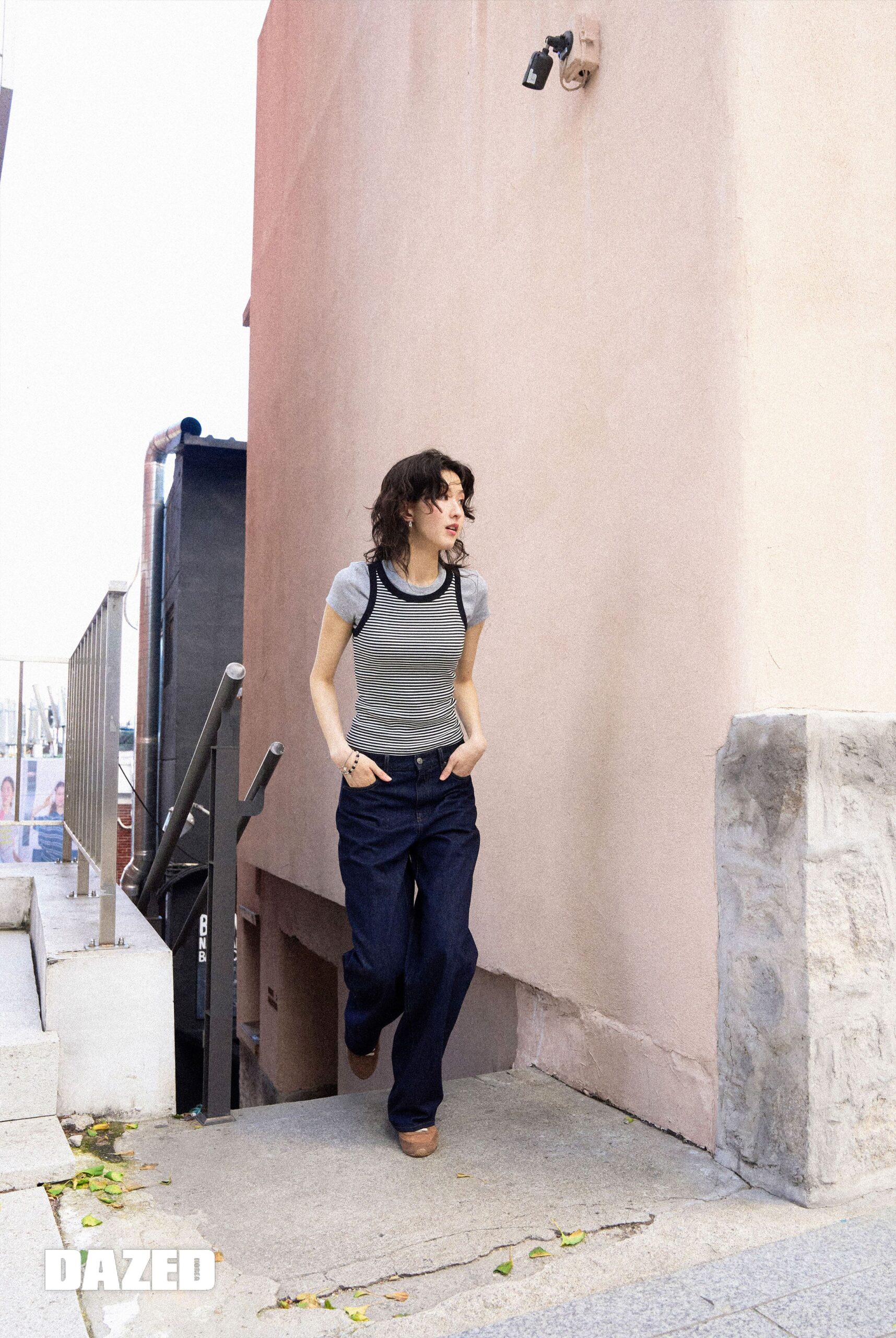 채운이 입은 유틸리티 셔츠와 레이어링 한 스트라이프 티셔츠, 스트레이트 진은 모두 유니클로(UNIQLO). 민주가 입은 집업 쇼트 블루종과 립브라탑, JW앤더슨 콜라보 스트레이트 진은 모두 유니클로(UNIQLO).