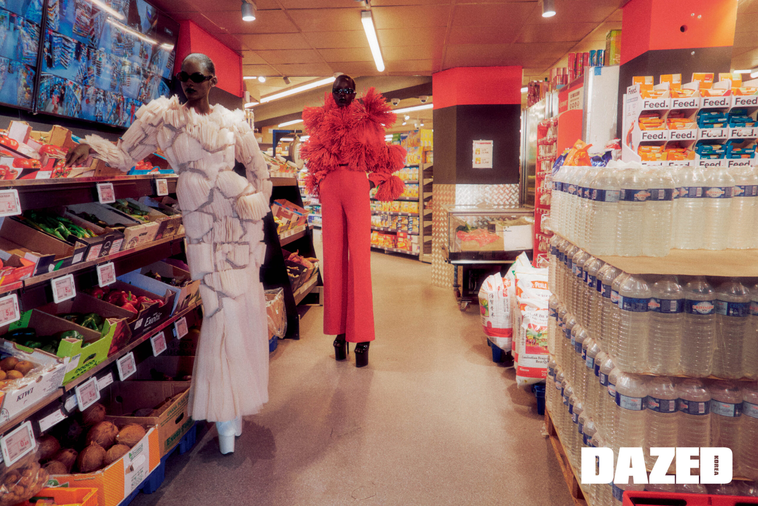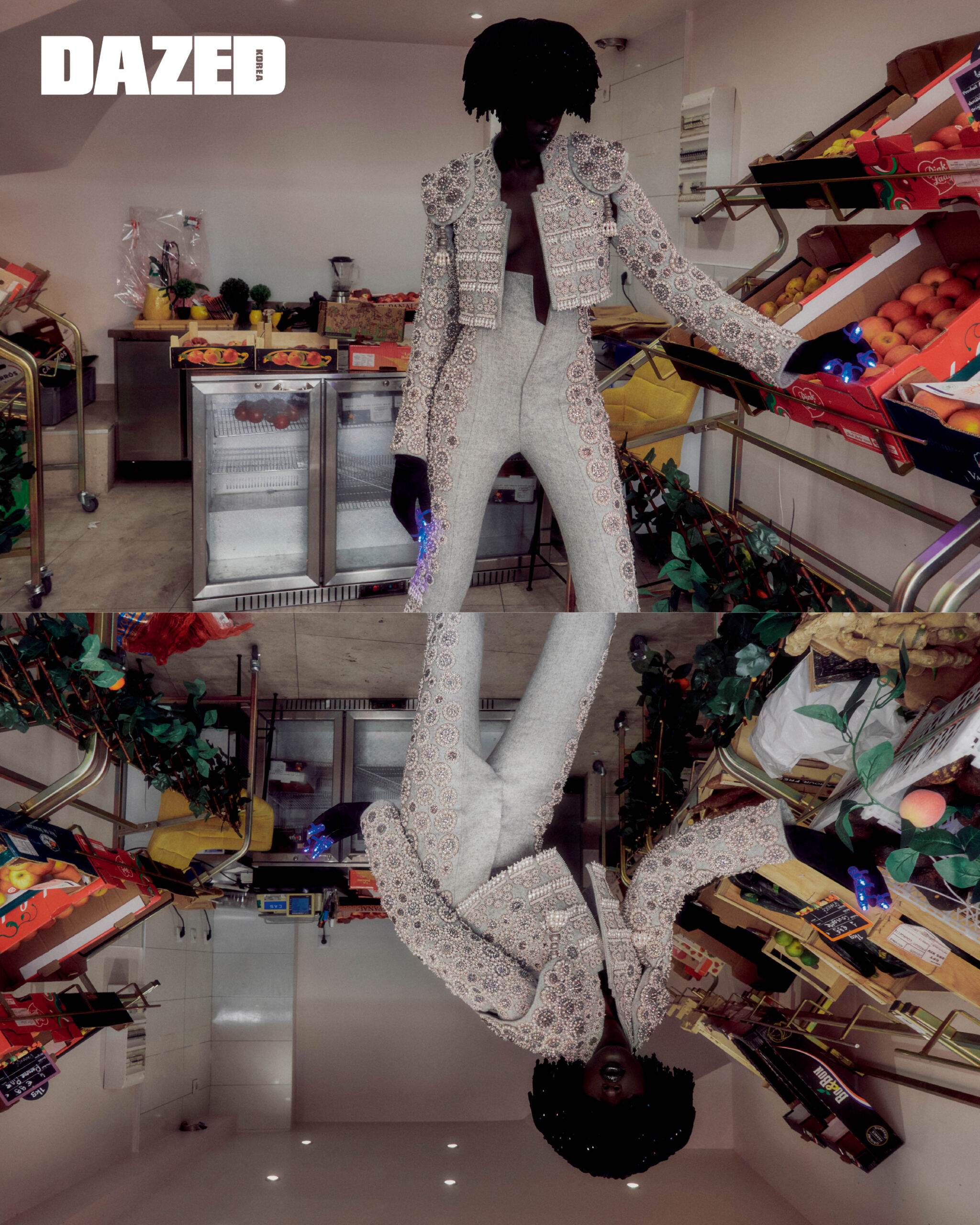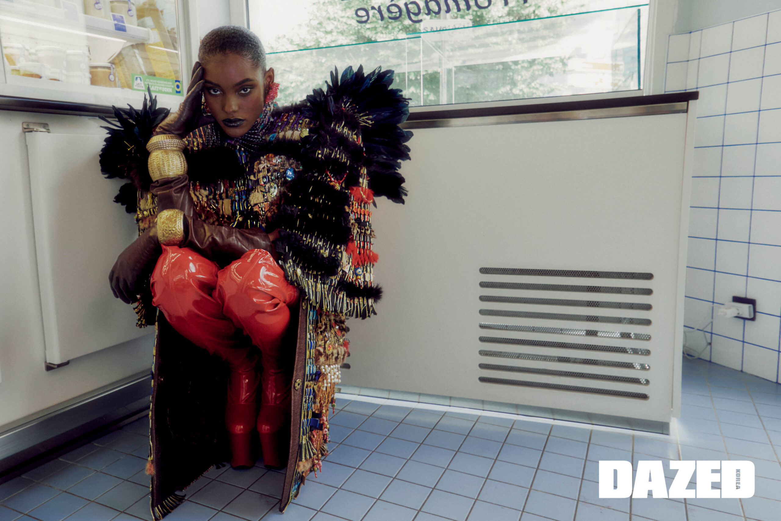 야니리스 실베리오가 입은 겹겹이 쌓은 구조적 실루엣의 드레스는 라미 알 알리 쿠튀르(Rami Al Ali Couture), 슈즈와 아이웨어는 에디터의 것. 아쿠올 뎅이 입은 풍성한 프린지 디테일 톱과 세일러 팬츠는 이마네 아이시 쿠튀르(Imane Ayissi Couture), 슈즈와 아이웨어는 에디터의 것.