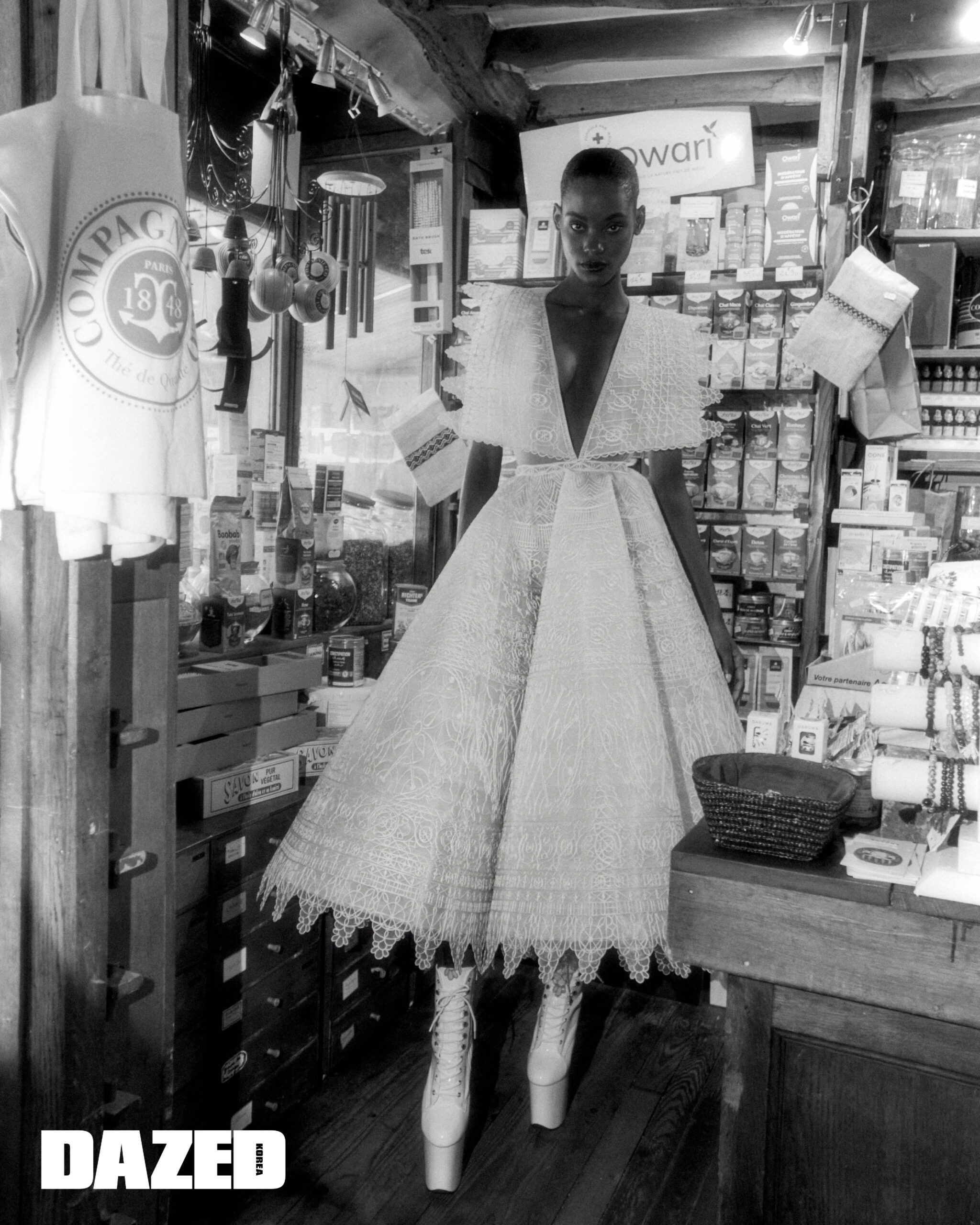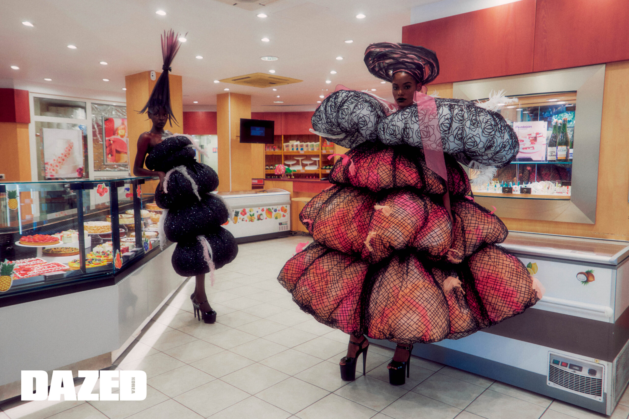아쿠올 뎅이 입은 원형 모티브의 트위드 드레스와 오간자 헤드피스는 빅터앤롤프 오트 쿠튀르(Viktor & Rolf Haute Couture), 슈즈는 에디터의 것. 야니리스 실베리오가 입은 풍성한 볼륨감의 드레스와 오간자 헤드피스는 빅터앤롤프 오트 쿠튀르(Viktor & Rolf Haute Couture), 슈즈는 에디터의 것.