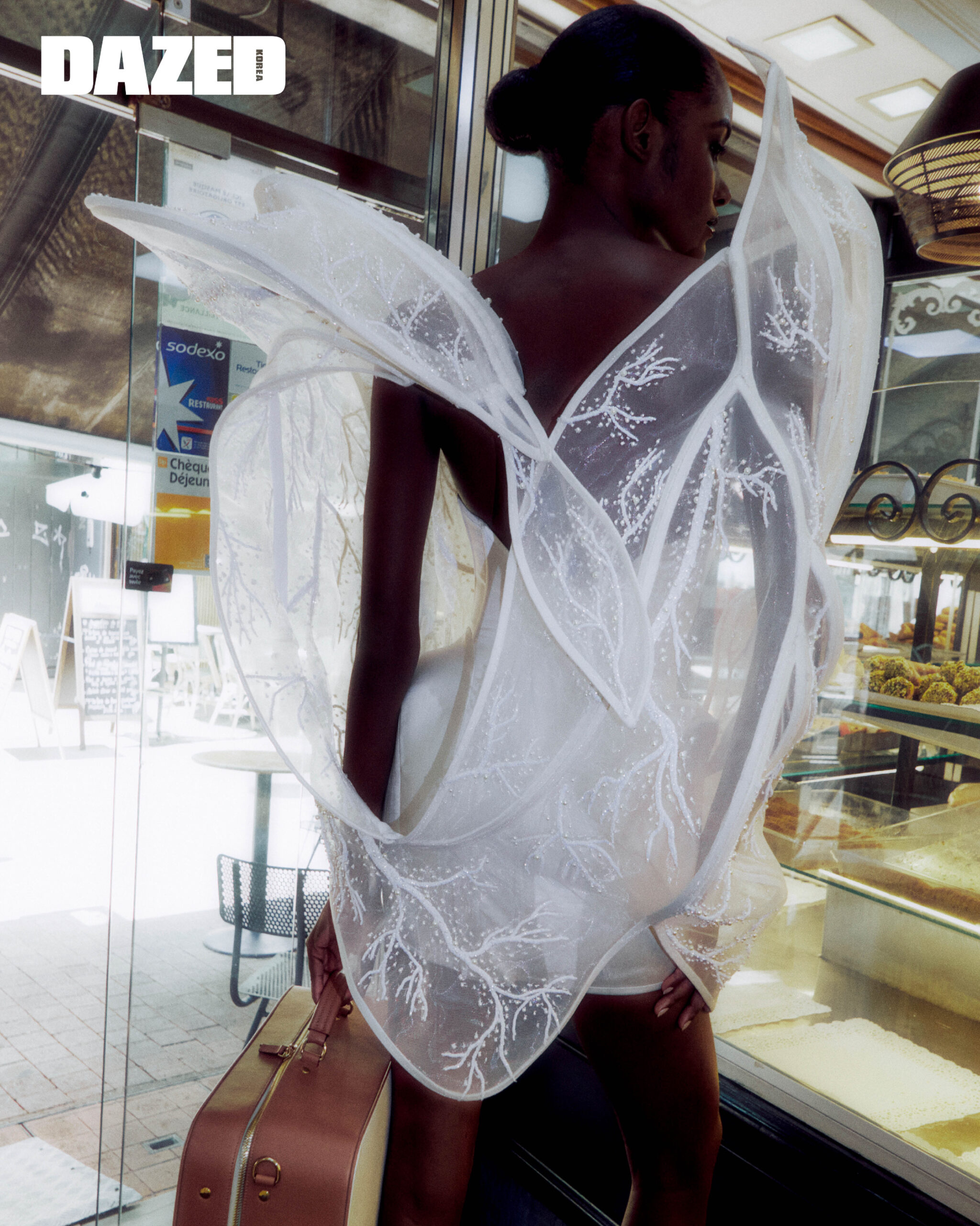 아플리케 장식의 구조적인 튜브톱 드레스는 라훌 미슈라 쿠튀르(Rahul Mishra Couture), 캔버스 슈트케이스는 유니폼(L/Uniform).