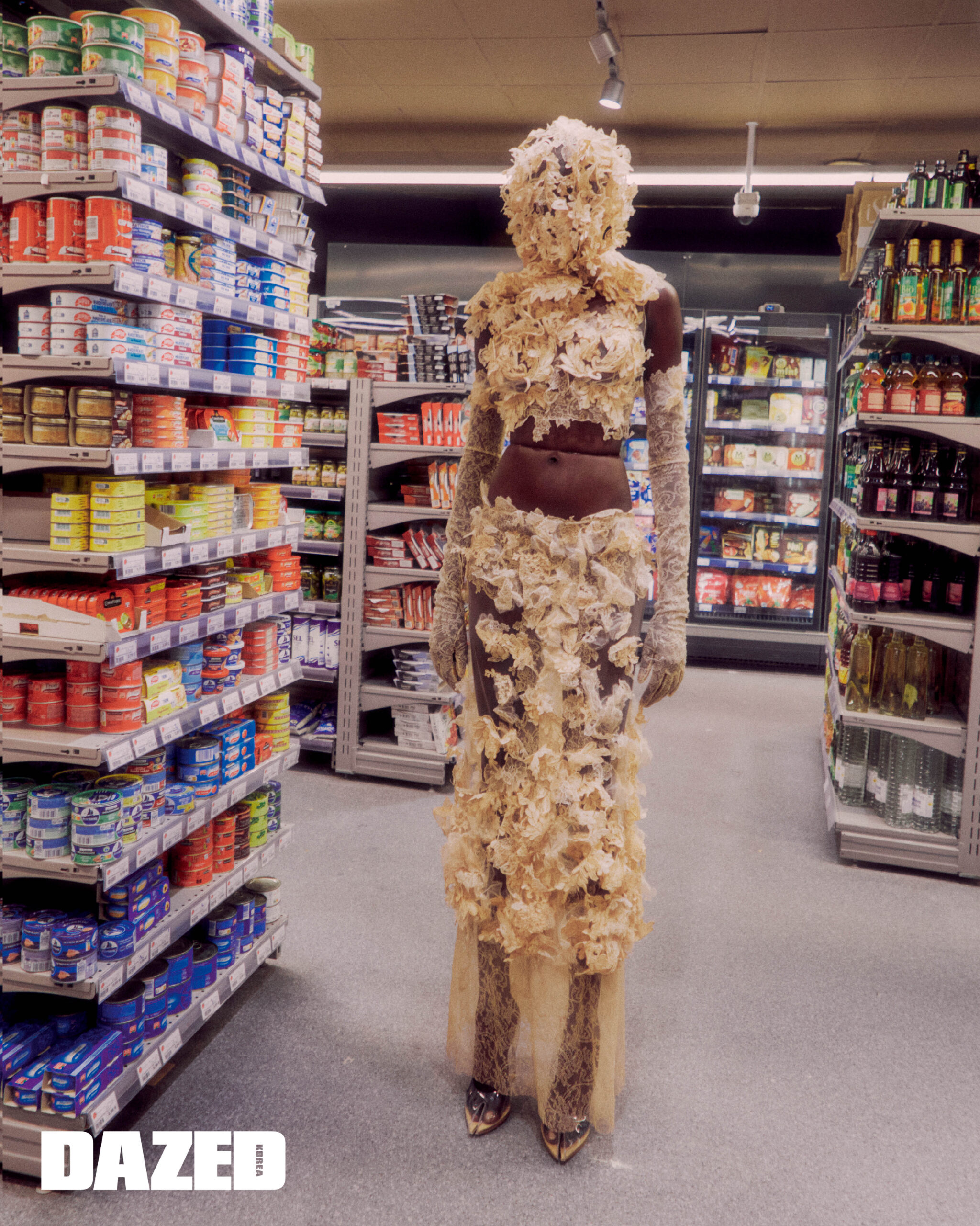 꽃잎을 형상화한 레이스 톱과 시스루 스커트, 허리를 강조한 라인 코르셋, 자수 장식 롱 글러브, 페이스 마스크는 모두 메종 마르지엘라 아티즈널(Maison Margiela Artisanal).