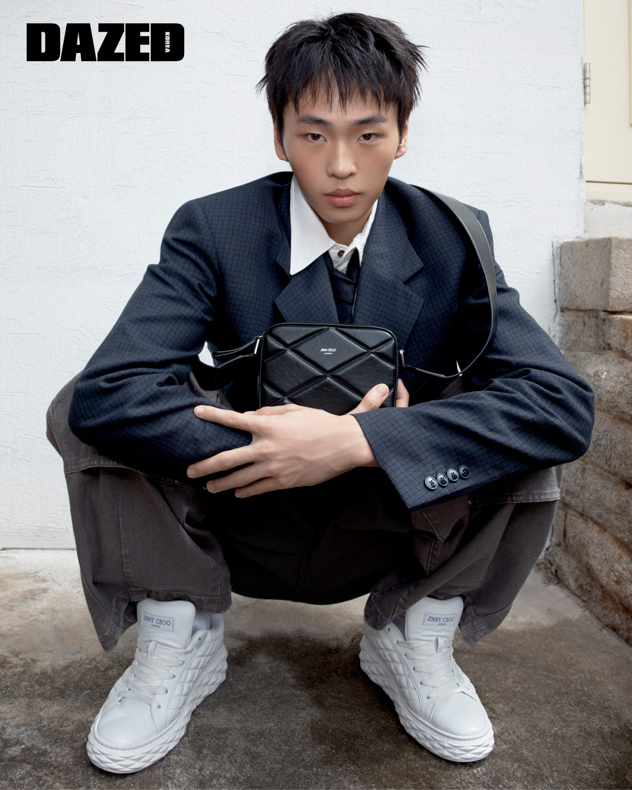화이트 컬러 다이아몬드 퀼팅 가죽 소재의 다이아몬드 맥시 M 스니커즈와 블랙 컬러 건메탈 다이아몬드 퀼팅 가죽 소재의 박스 카메라 스몰 백은 지미추(Jimmy Choo), 셔츠와 팬츠는 겐조(Kenzo), 재킷과 타이는 에디터의 것.