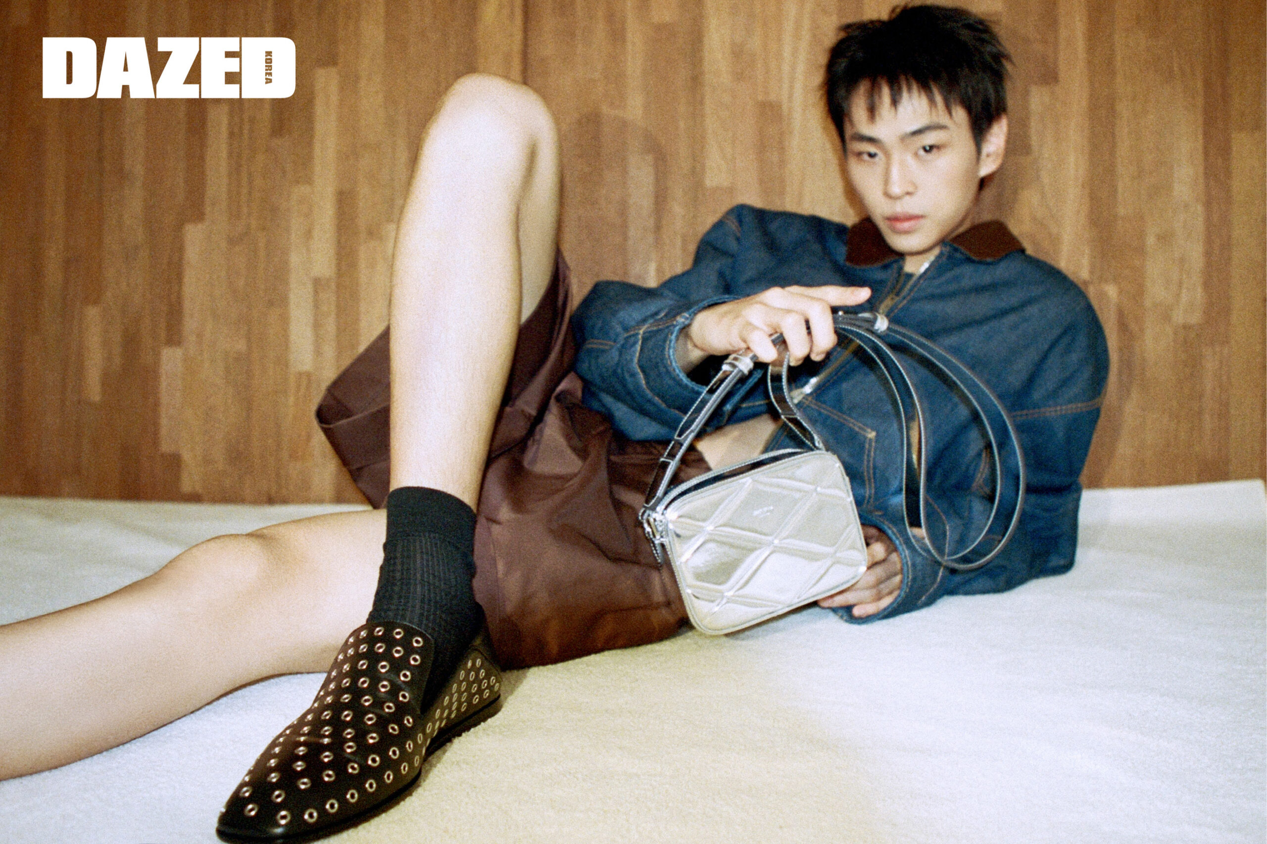 아일릿 디테일 엘리엇 슬리퍼와 실버 컬러 다이아몬드 퀼팅 미러 패브릭 소재의 박스 카메라 스몰 백은 지미추(Jimmy Choo), 데님 재킷은 아크네 스튜디오(Acne Studios), 브라운 쇼츠는 렉토(Recto), 삭스는 에디터의 것.