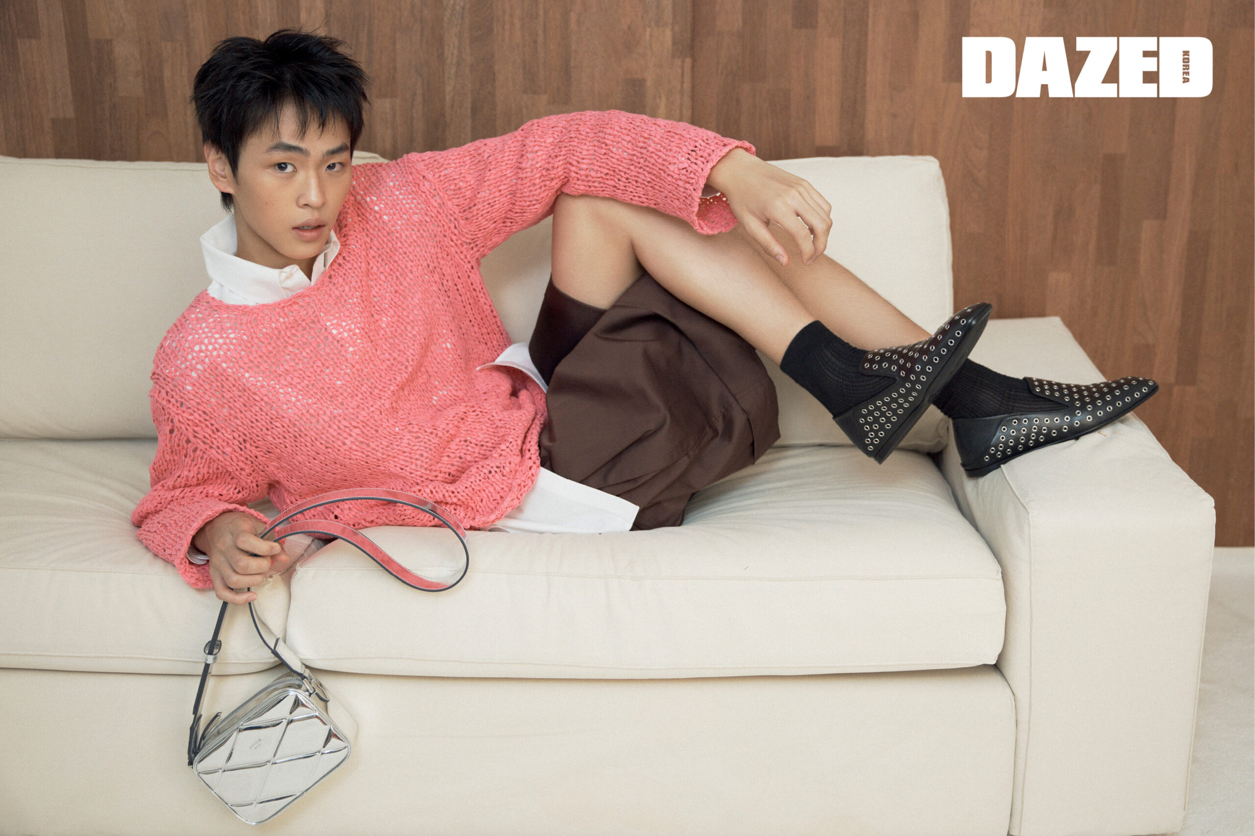 아일릿 디테일 엘리엇 슬리퍼와 실버 컬러 다이아몬드 퀼팅 미러 패브릭 소재의 박스 카메라 스몰 백은 지미추(Jimmy Choo), 핑크 니트 톱은 꼼데가르송 옴므 플러스(Comme des Garçons Homme Plus), 브라운 쇼츠는 렉토(Recto), 셔츠와 삭스는 에디터의 것.