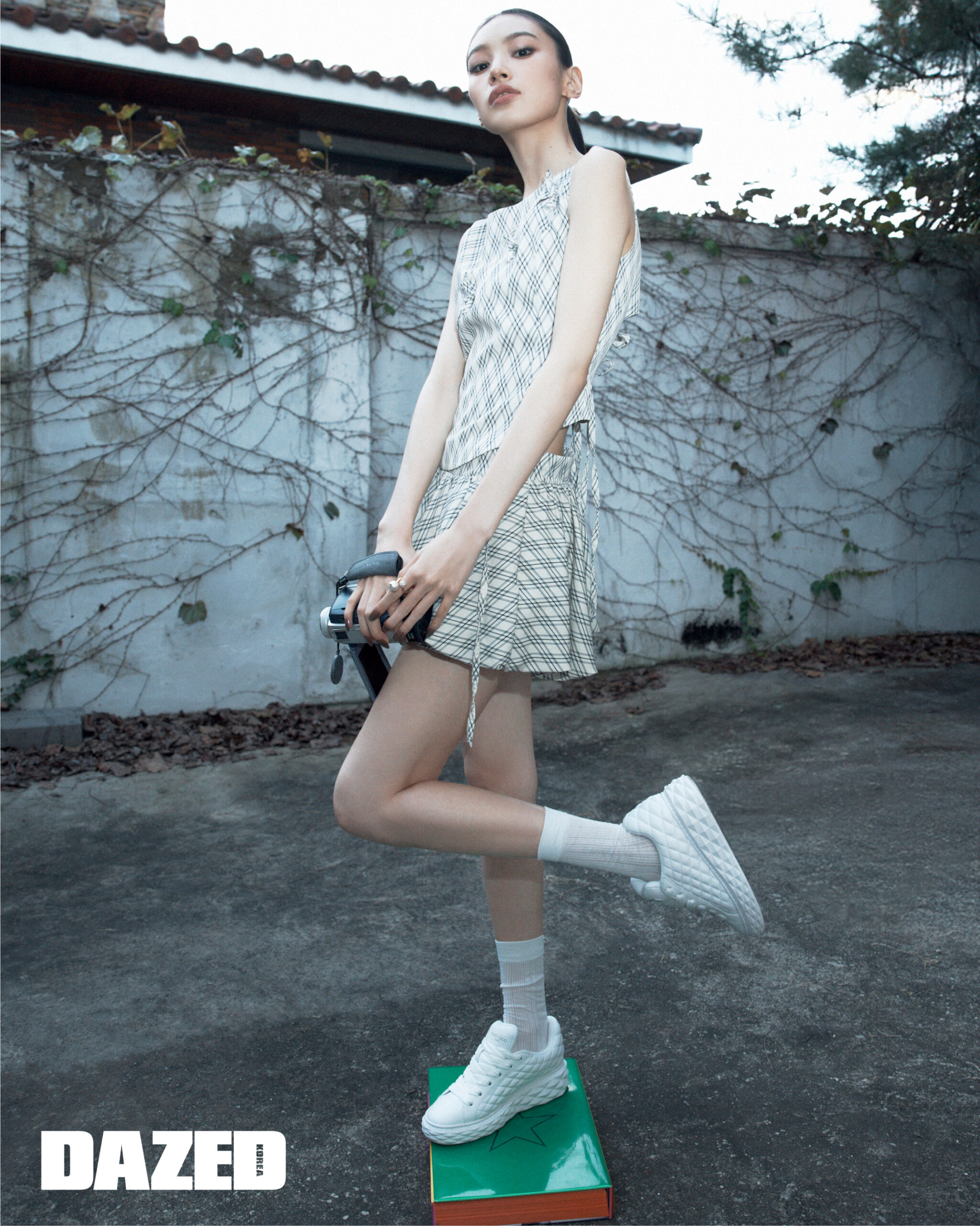 화이트 컬러 다이아몬드 퀼팅 나파 가죽 소재의 다이아몬드 맥시 F 스니커즈, 진주와 크리스털을 세팅한 아우리 링은 지미추(Jimmy Choo), 체크 톱과 스커트는 카시코(Kashiko), 삭스는 에디터의 것.