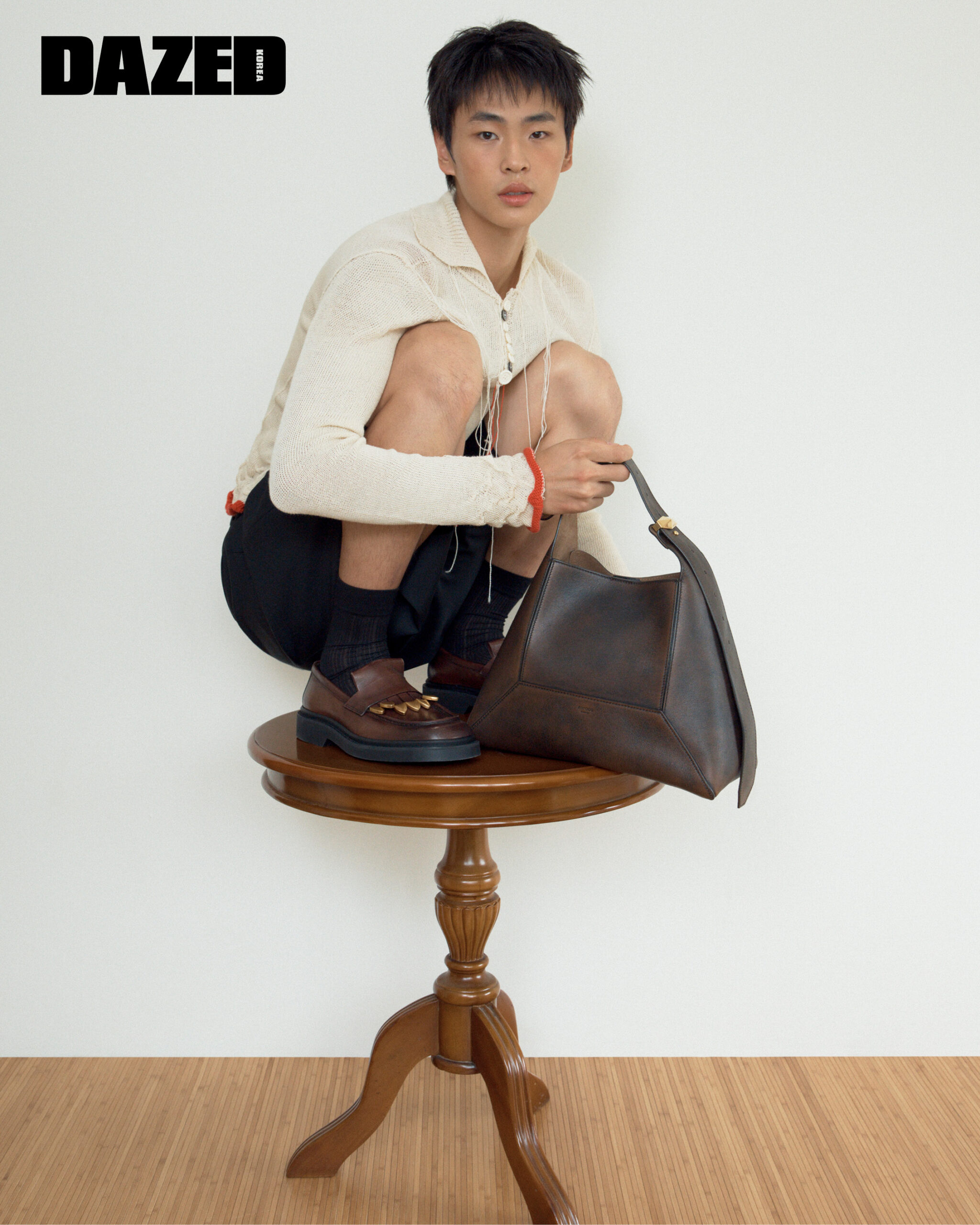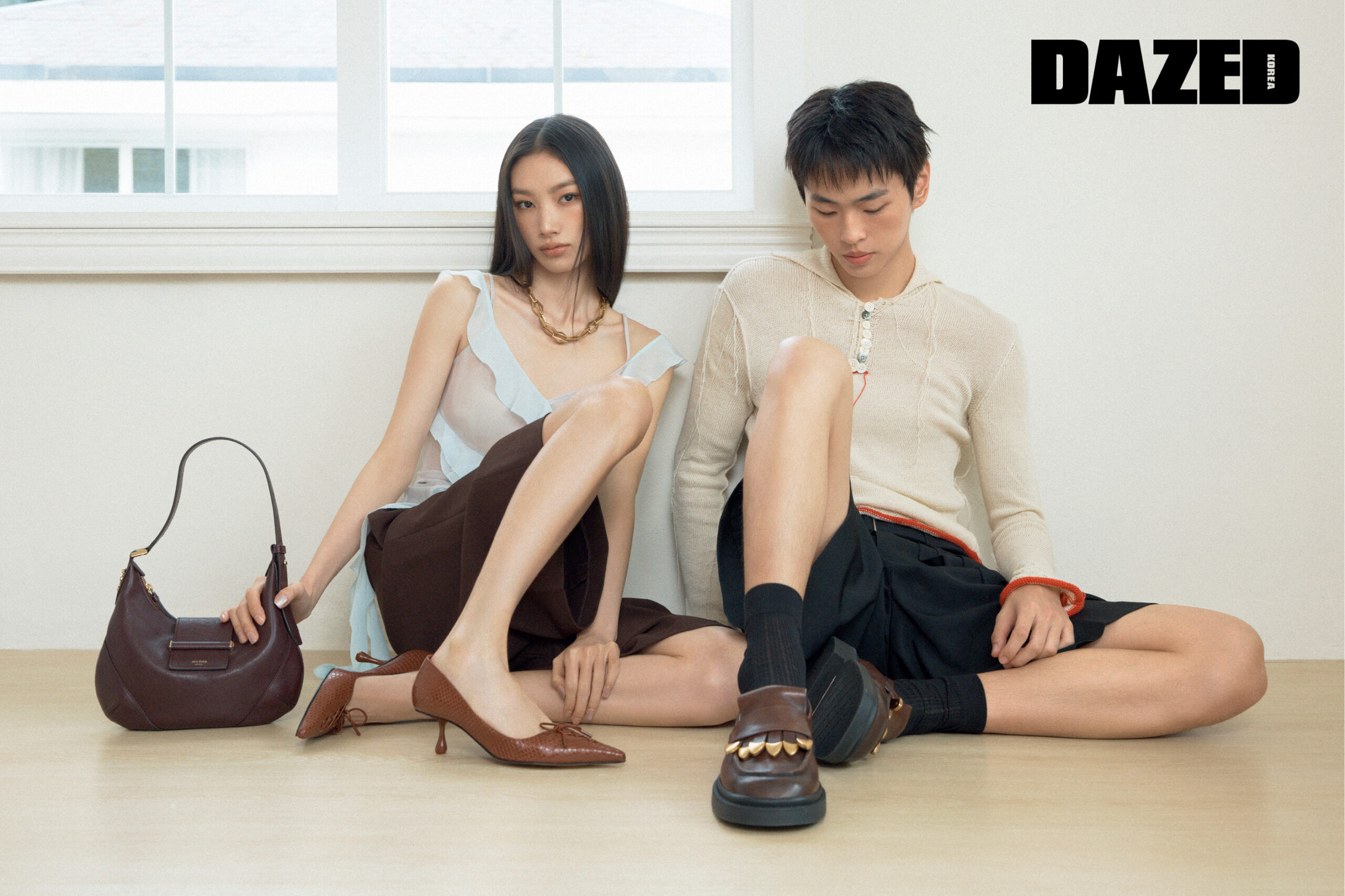 유엔씬이 착용한 코냑 엘라페 프린트 가죽 소재의 스칼렛50 펌프스와 다이아몬드 체인 네크리스, 딥 메를로 바이커 가죽 소재의 바 호보 스몰 백은 지미추(Jimmy Choo), 러플 톱과 브라운 쇼츠는 와이씨에이치(YCH). 채운이 착용한 태슬 디테일 모카 버니시드 가죽 소재의 버프 태슬 로퍼는 지미추(Jimmy Choo), 니트 톱은 택(Taekh), 쇼츠는 와이씨에이치(YCH), 삭스는 에디터의 것.