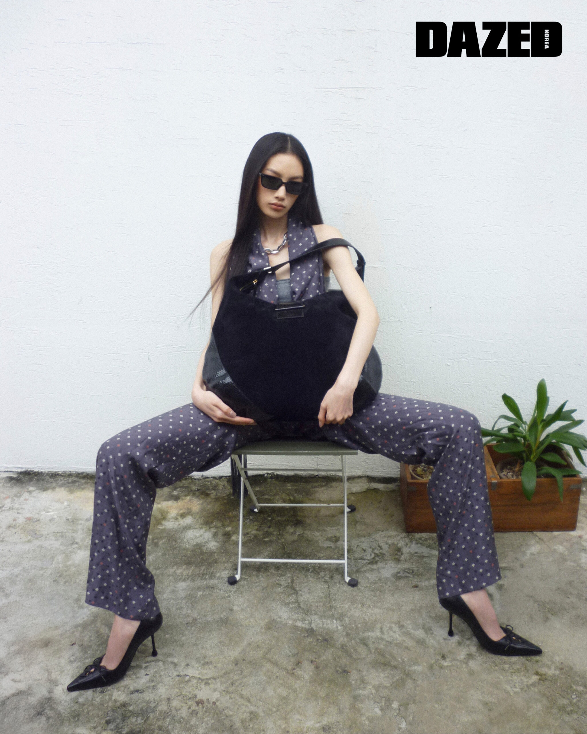 나파 가죽 소재의 스칼렛95 펌프스와 조시 선글라스, 앤티크 실버 컬러 다이아몬드 체인 네크리스, 샤이니 스네이크 프린트 레더 트리밍 디테일의 블랙 스웨이드 소재의 바 호보 라지 백은 모두 지미추(Jimmy Choo), 스카프 디테일 보디슈트는 아크네 스튜디오(Acne Studios), 이너 톱은 르917(LE17SEPTEMBRE).