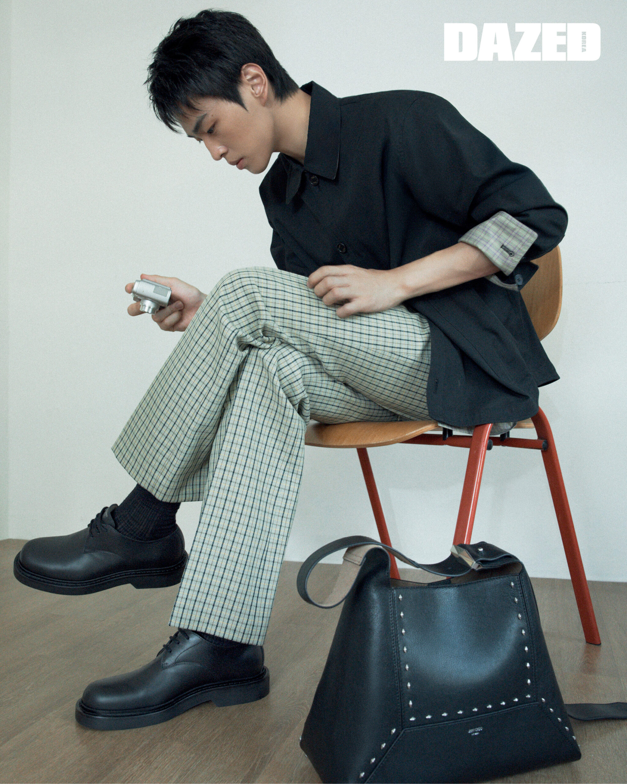 블랙 컬러 박스 송아지 가죽 소재의 로완 더비 로퍼와 스터드 장식의 다이아몬드 호보 미디엄 백은 지미추(Jimmy Choo), 재킷과 팬츠는 잉크(EENK), 삭스는 에디터의 것.