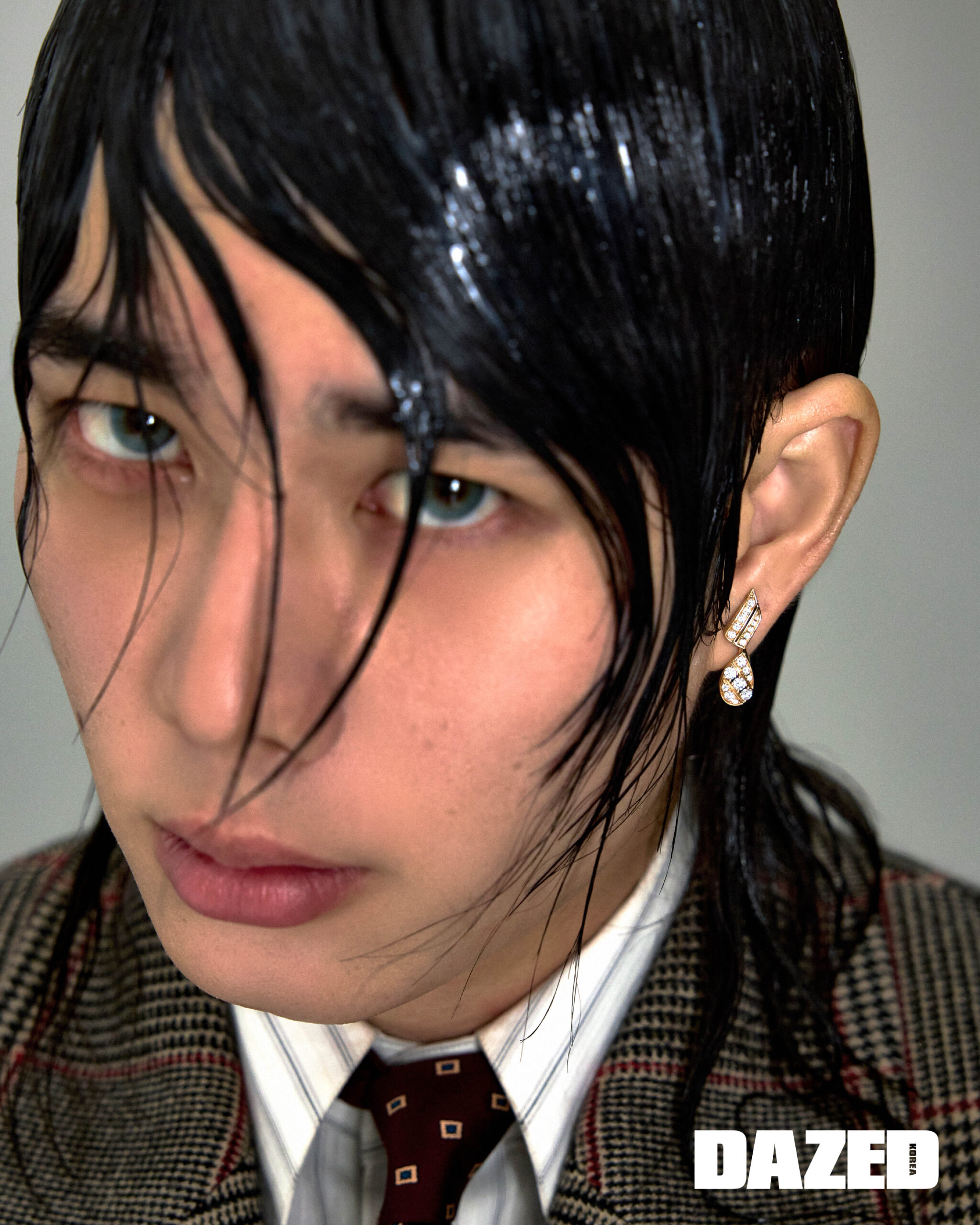 로즈 골드에 브릴리언트 컷 다이아몬드를 세팅한 조세핀 아그레뜨 이어링은 쇼메(Chaumet), 체크 재킷과 셔츠, 타이는 모두 생 로랑 by 안토니 바카렐로(Saint Laurent by Anthony Vaccarello).