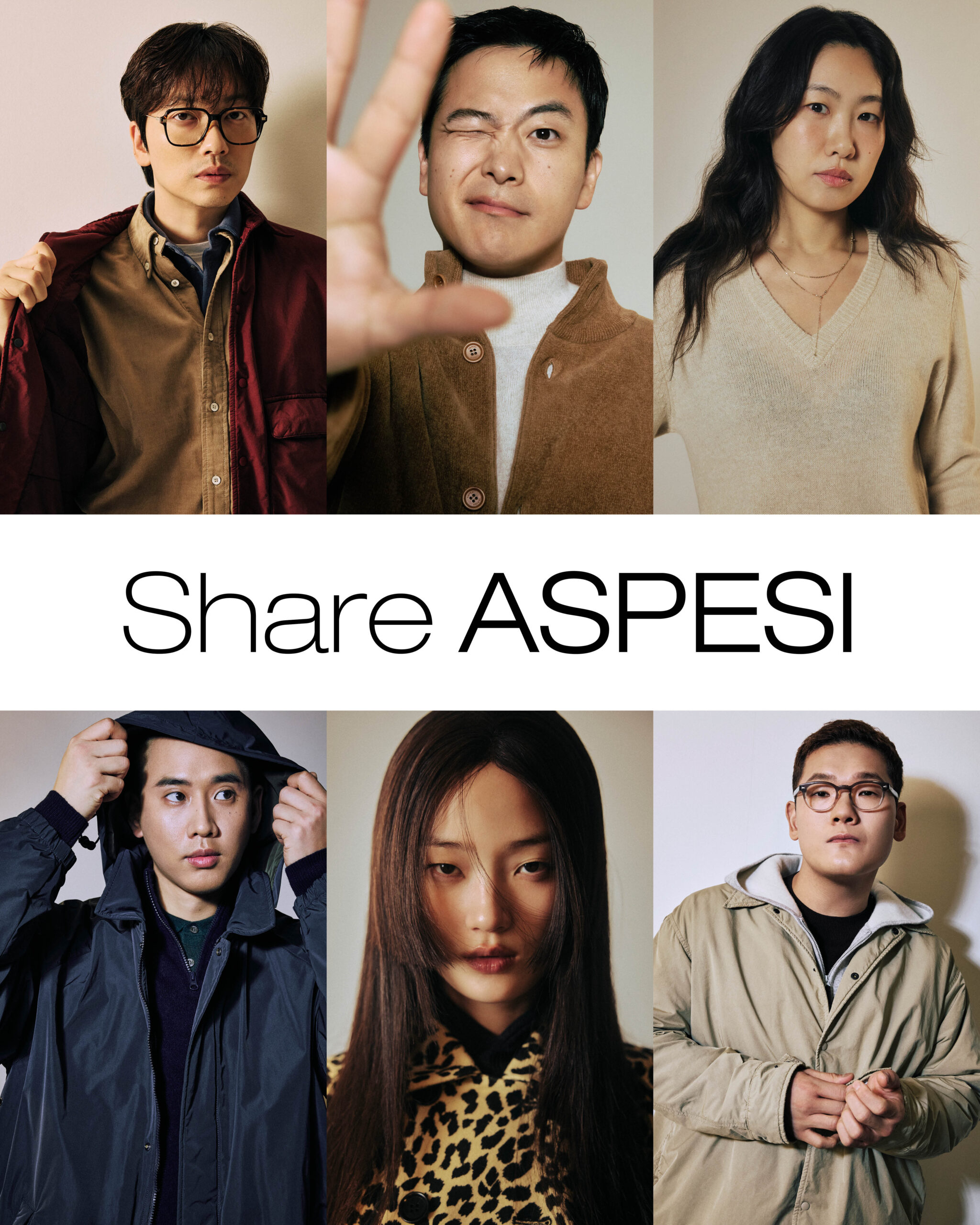 이동휘가 입은 버건디 가먼트 다잉 아우터와 브러시드 코튼 셔츠, 소프트 테리 저지 칼라 셔츠는 모두 아스페시(Aspesi). 박태일이 입은 하이넥 플러피 벨루어 니트 아우터와 캐시미어 하프넥 니트 스웨터는 아스페시(Aspesi). 정진아가 입은 아크 울과 캐시미어 블렌드 브이넥 니트 톱은 아스페시(Aspesi). 김태성이 입은 베이지 가먼트 다잉 아우터와 더블 페이스 울 니트 집업 후디, 울 라운드넥 니트 스웨터는 모두 아스페시(Aspesi). 신현지가 입은 레오퍼드 헤리티지 패턴 더블 코트와 이너 톱은 아스페시(Aspesi). 문승지가 입은 탈부착이 가능한 하이브리드 아우터와 하프넥 집업 니트 톱, 캐시미어 폴로 니트 스웨터는 모두 아스페시(Aspesi).