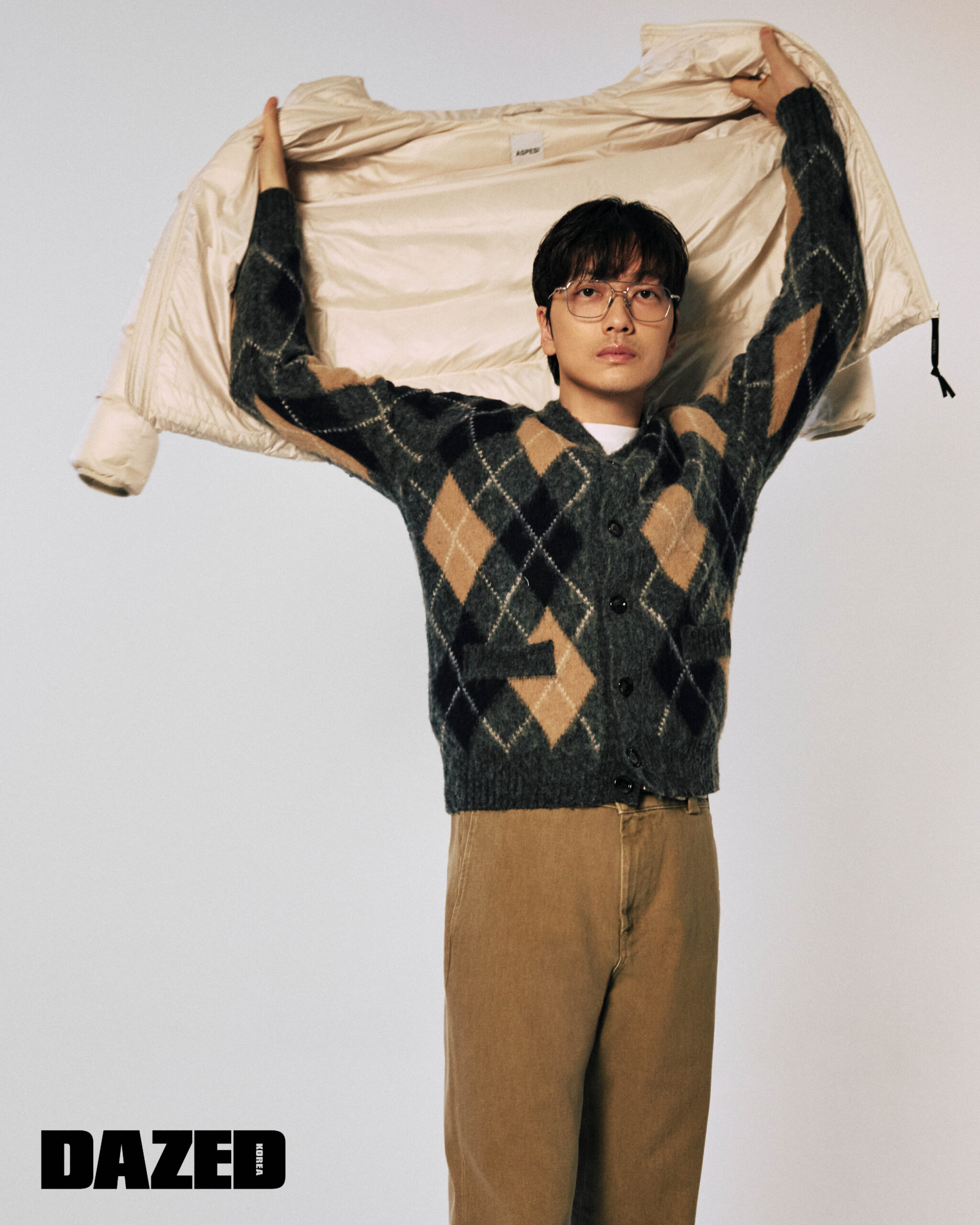 아이보리 푸퍼 재킷과 아가일 패턴 카디건, 티셔츠, 베이지 코튼 팬츠는 모두 아스페시(Aspesi).