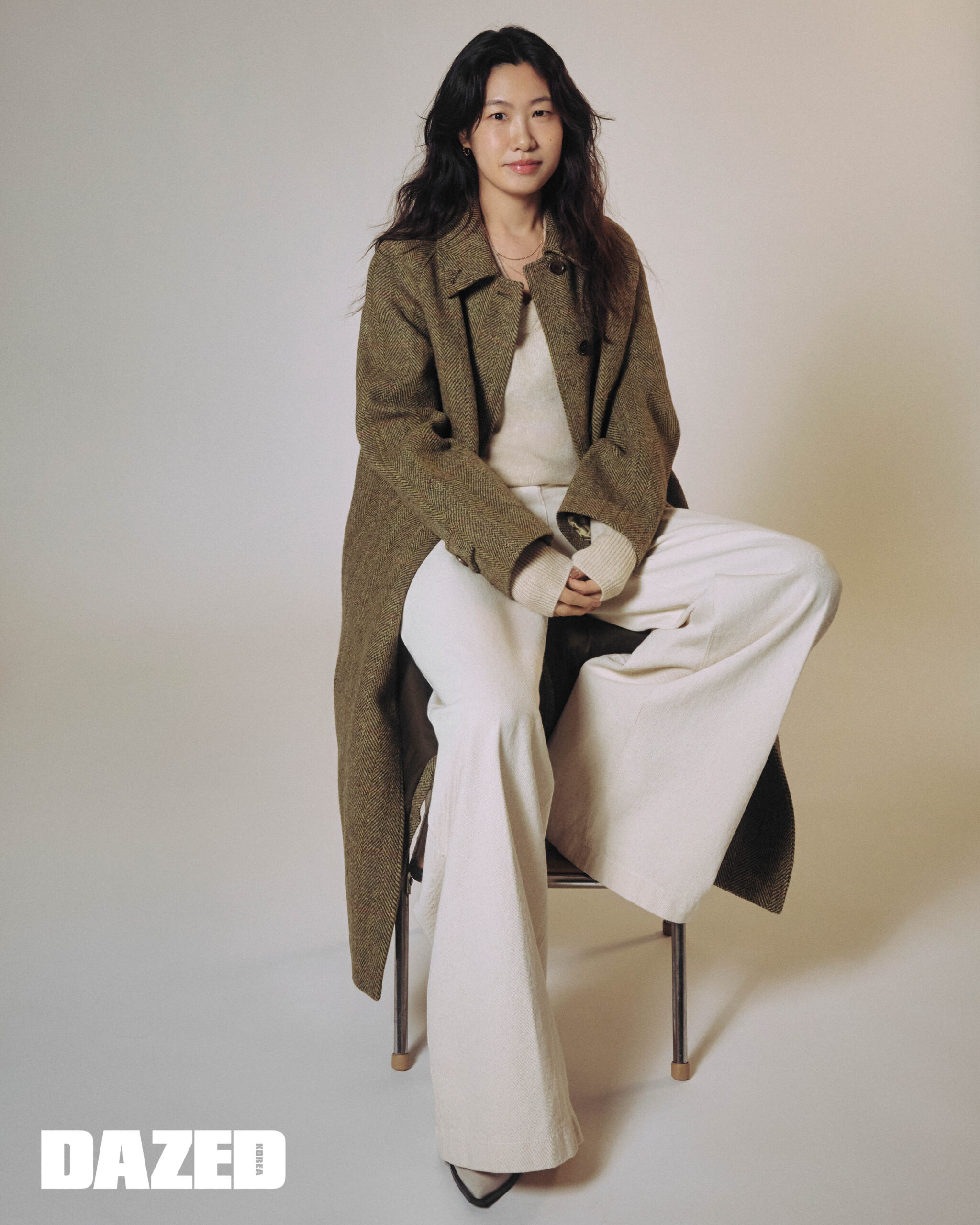 해리스 트위드 롱 맥코트와 아크 울과 캐시미어 블렌드 브이넥 니트 톱, 아이보리 와이드 데님 팬츠는 모두 아스페시(Aspesi).