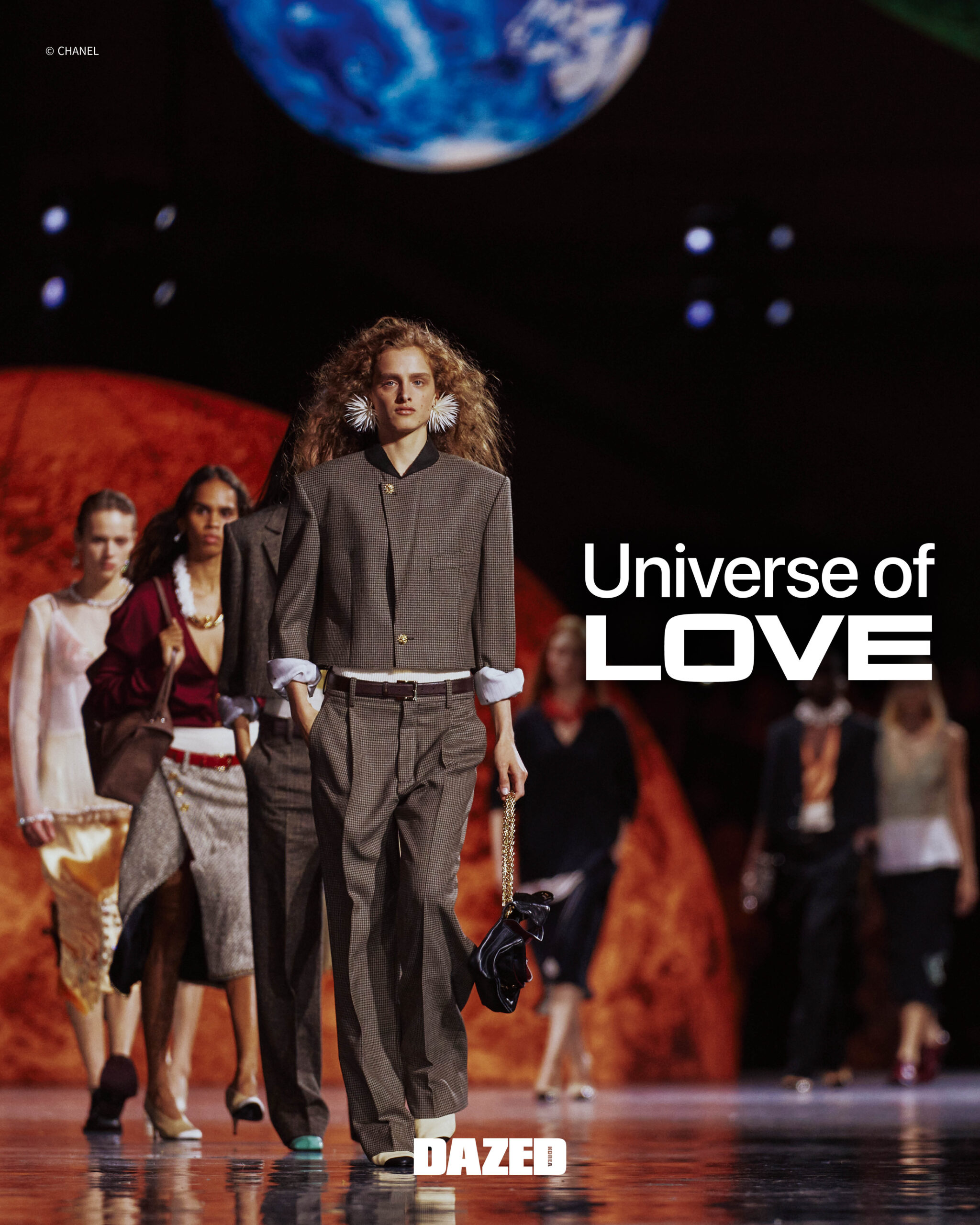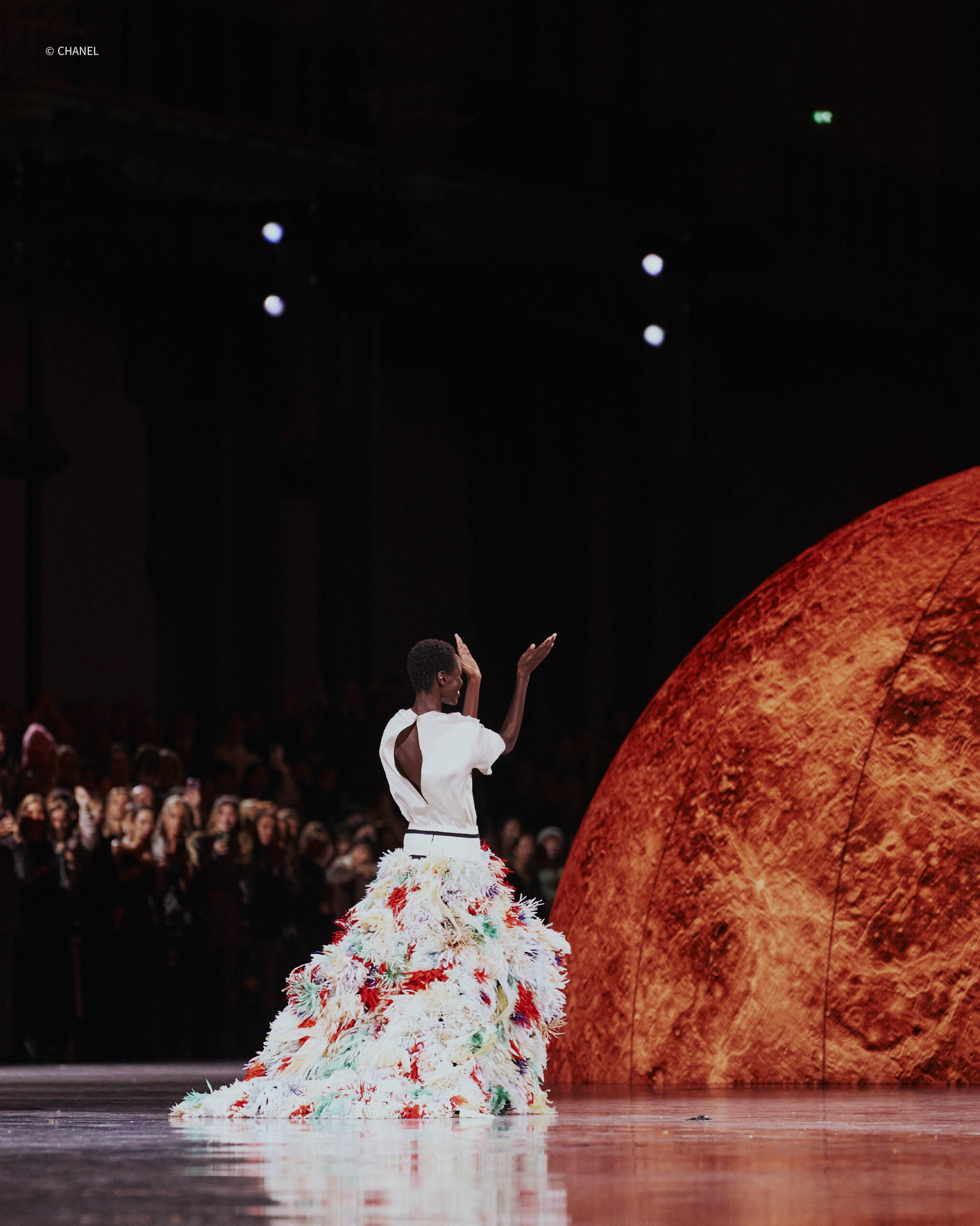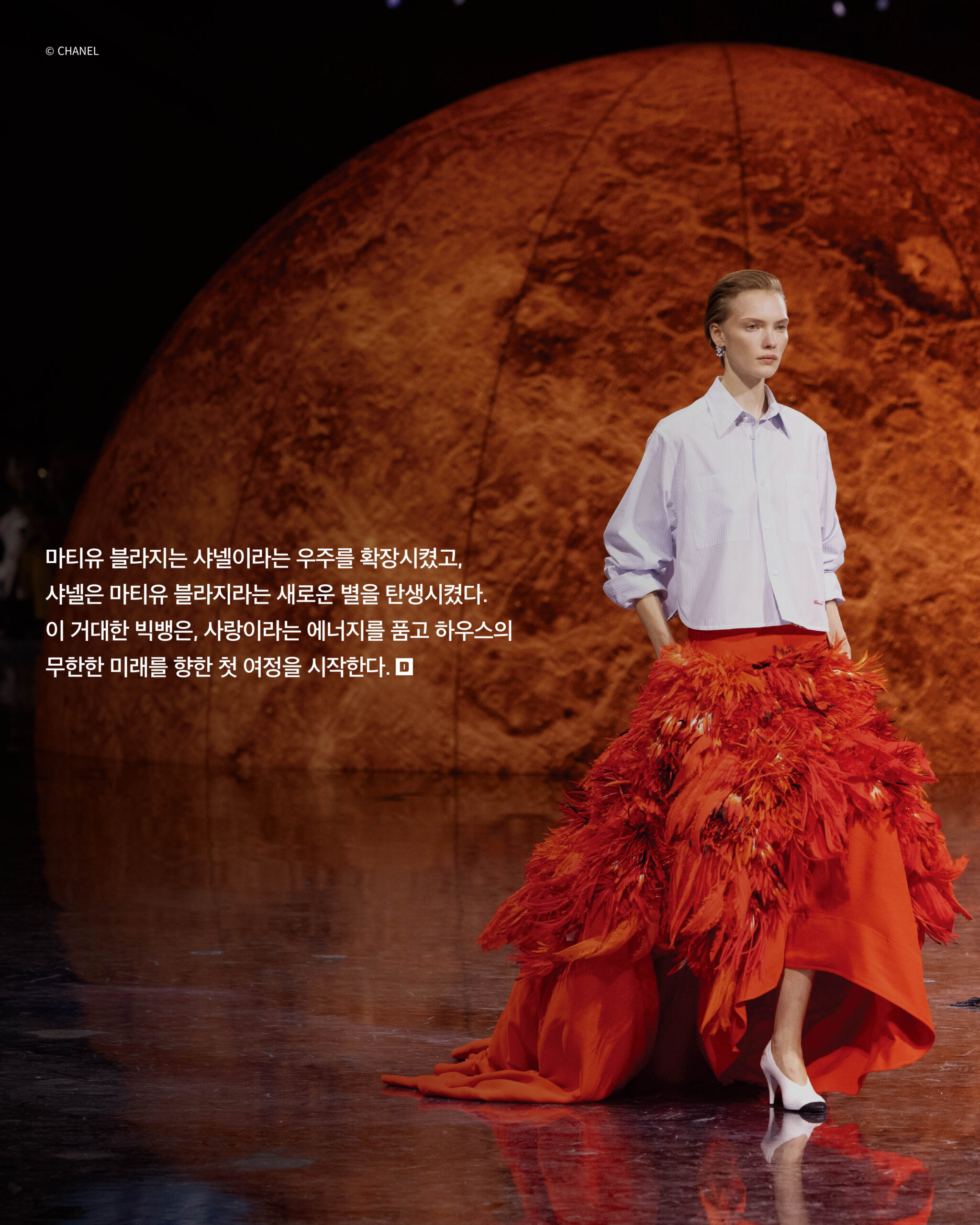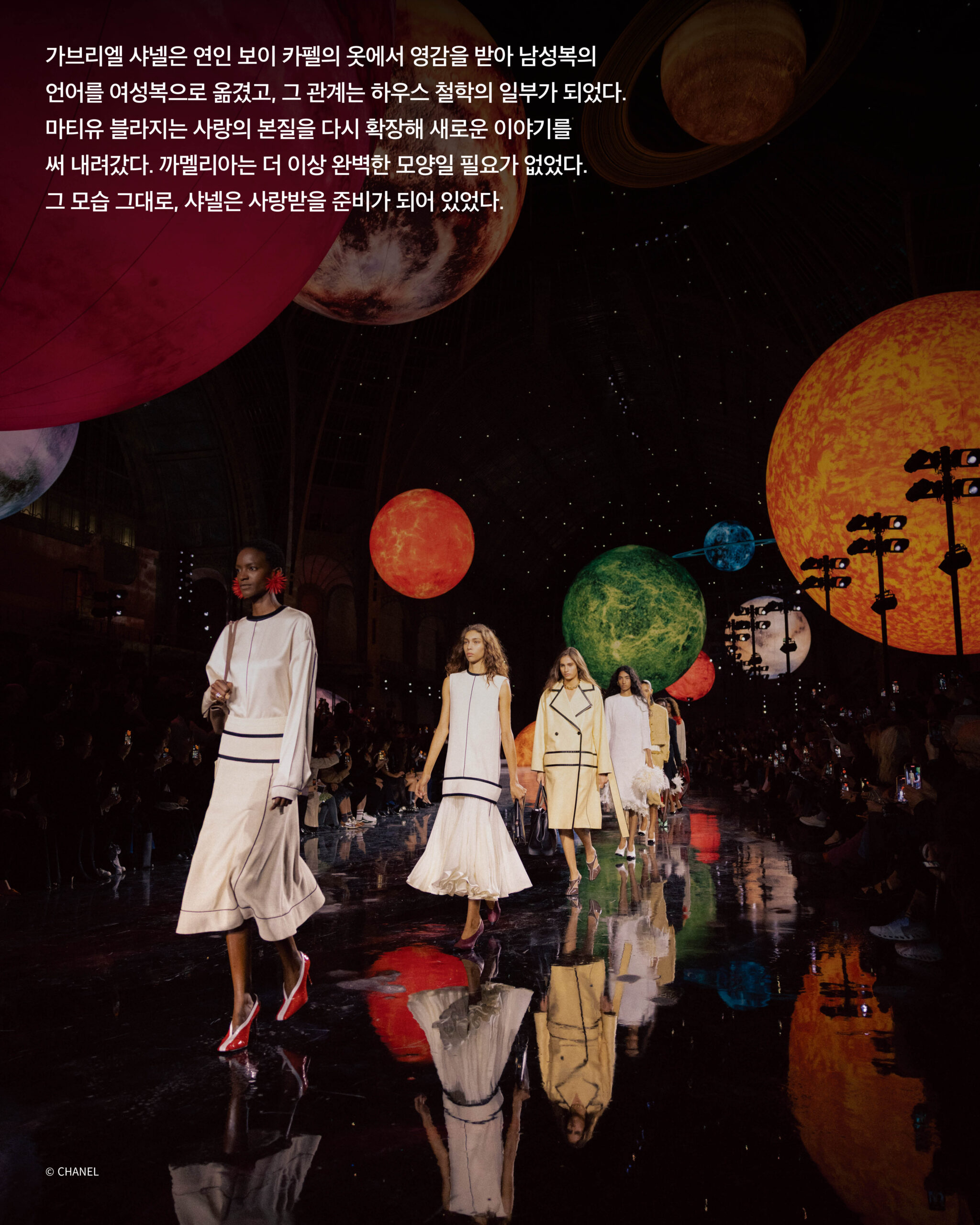 샤넬이라는 고요한 우주, 그 안에서 일어난 거대한 폭발. 마티유 블라지의 첫 샤넬 컬렉션을 앞두고 새로운 주인을 맞이한 그랑팔레는 마치 하나의 우주가 된듯 전혀 새로운 차원으로 변모했다. 무수한 별과 행성이 부유하는 듯한 공간. 빛을 반사하는 검정 바닥은 팽창하는 우주 같았다. 관객들의 숨소리조차 잦아들고, 시선은 오직 무대 위에 집중되었다. 성별도, 나이도, 규정된 정체성도 그 안에선 의미를 잃었다. 누구도 소외되지 않고, 모두가 마티유 블라지의 ‘처음’에 주목했다.