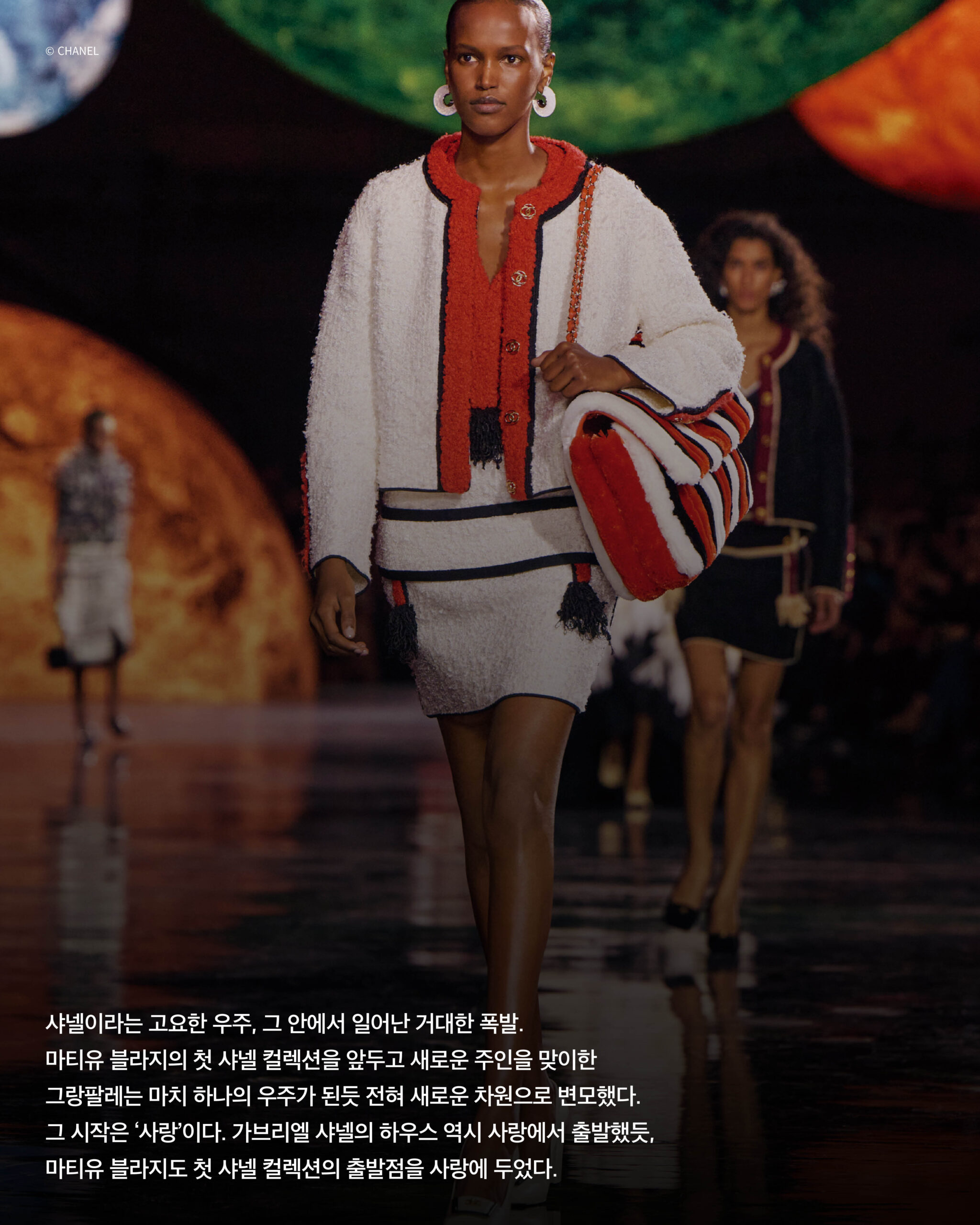그 시작은 ‘사랑’이다. 가브리엘 샤넬의 하우스 역시 사랑에서 출발했듯, 마티유 블라지도 첫 샤넬 컬렉션의 출발점을 사랑에 두었다. 그 사랑은 단순한 낭만이 아니다. 타인의 차이를 받아들이고, 불완전함까지 껴안으려는 태도다. 가브리엘 샤넬은 연인 보이 카펠의 옷에서 영감을 받아 남성복의 언어를 여성복으로 옮겼고, 그 관계는 하우스 철학의 일부가 되었다. 마티유 블라지는 사랑의 본질을 다시 확장해 새로운 이야기를 써 내려갔다. 그의 첫 번째 룩, 슈트 셋업이 어둠 속에서 빛을 받으며 런웨이를 가로지르듯 나타나자 포용적이고 자유로운 에너지가 현장을 가득 채웠다. 성별을 넘나드는 경계 없는 디자인은 자연스럽게 어우러지며 모든 요소가 하나로 포용되었다. 그러고는 폭발하듯 나아갔다. 트위드는 해체되고, 실루엣은 유연히 흐르며, 니트는 춤추듯 흘렀다. 까멜리아는 더 이상 완벽한 모양일 필요가 없었다. 구겨진 까멜리아는 완벽하지 않기에 오히려 더 아름다운. 그 모습 그대로, 샤넬은 사랑받을 준비가 되어 있었다. 쇼가 중반부를 넘어서자, 자유롭고 강렬한 에너지를 품은 ‘Rhythm Is a Dancer’의 오케스트라 버전이 우주 공간을 채웠다. 그 리듬에 맞춰 터지듯 피어난, 마티유 블라지가 새롭게 재해석한 까멜리아 룩이 줄지어 등장했다. 특히 마지막 무대를 장식한 모델 아와르 오디앙Awar Odhiang은 춤을 추며 우주를 자유롭게 누볐고, 관객들은 그와 마티유 블라지를 향해 환희와 찬사를 보냈다. 마티유 블라지는 샤넬의 시간 속에 새로운 속도와 방향을 불어넣었다. 사랑과 자유는 더는 이상이 아니라 이 무한한 팽창의 궤도 안에서 여전히 퍼지고 있다. 그는 샤넬이라는 우주를 확장시켰고, 샤넬은 마티유 블라지라는 새로운 별을 탄생시켰다. 이 거대한 빅뱅은, 사랑이라는 에너지를 품고 하우스의 무한한 미래를 향한 첫 여정을 시작한다.