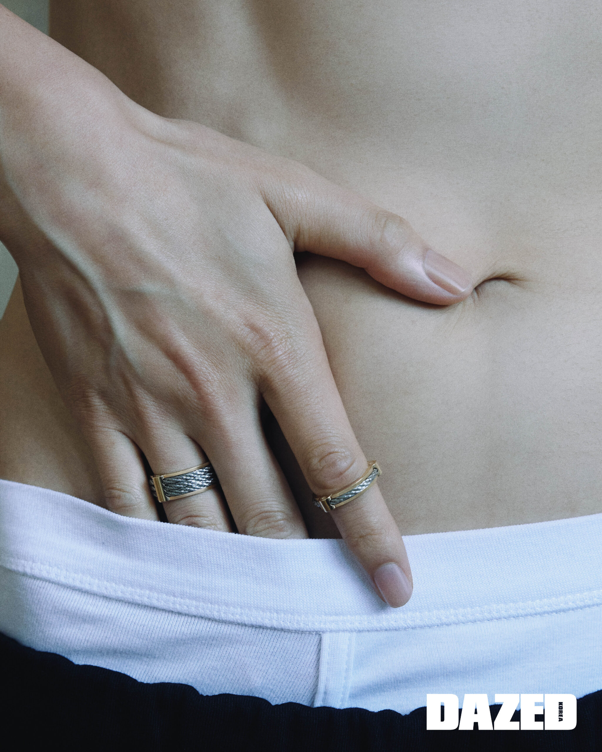 옐로 골드와 스틸의 포스텐 윈치 3로우 링과 포스텐 윈치 1로우 링은 프레드(Fred), 팬츠는 돌체앤가바나(Dolce&Gabbana), 브리프는 에디터의 것.