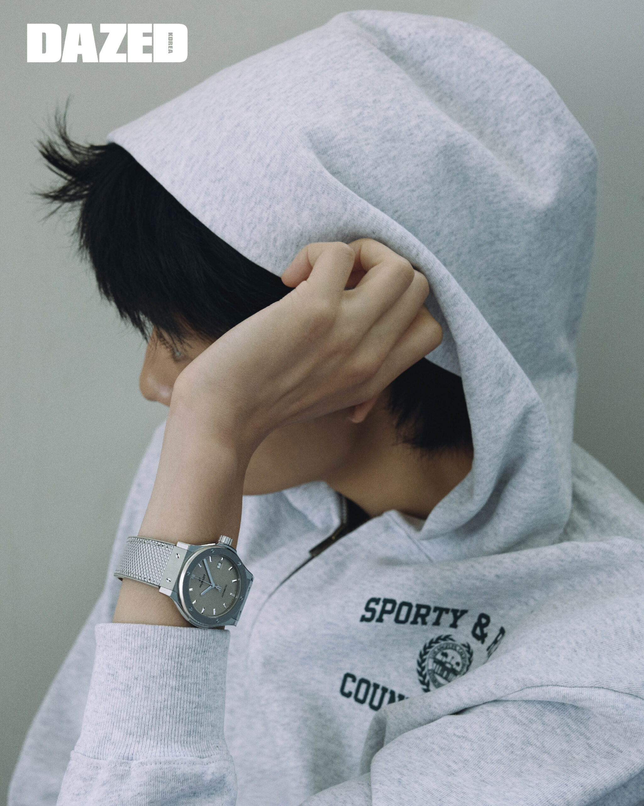 최대 48시간 파워리저브가 가능한 셀프와인딩 무브먼트를 탑재한 클래식 퓨전 에센셜 토프는 위블로(Hublot), 후드 집업은 스포티앤리치(Sporty&Rich).