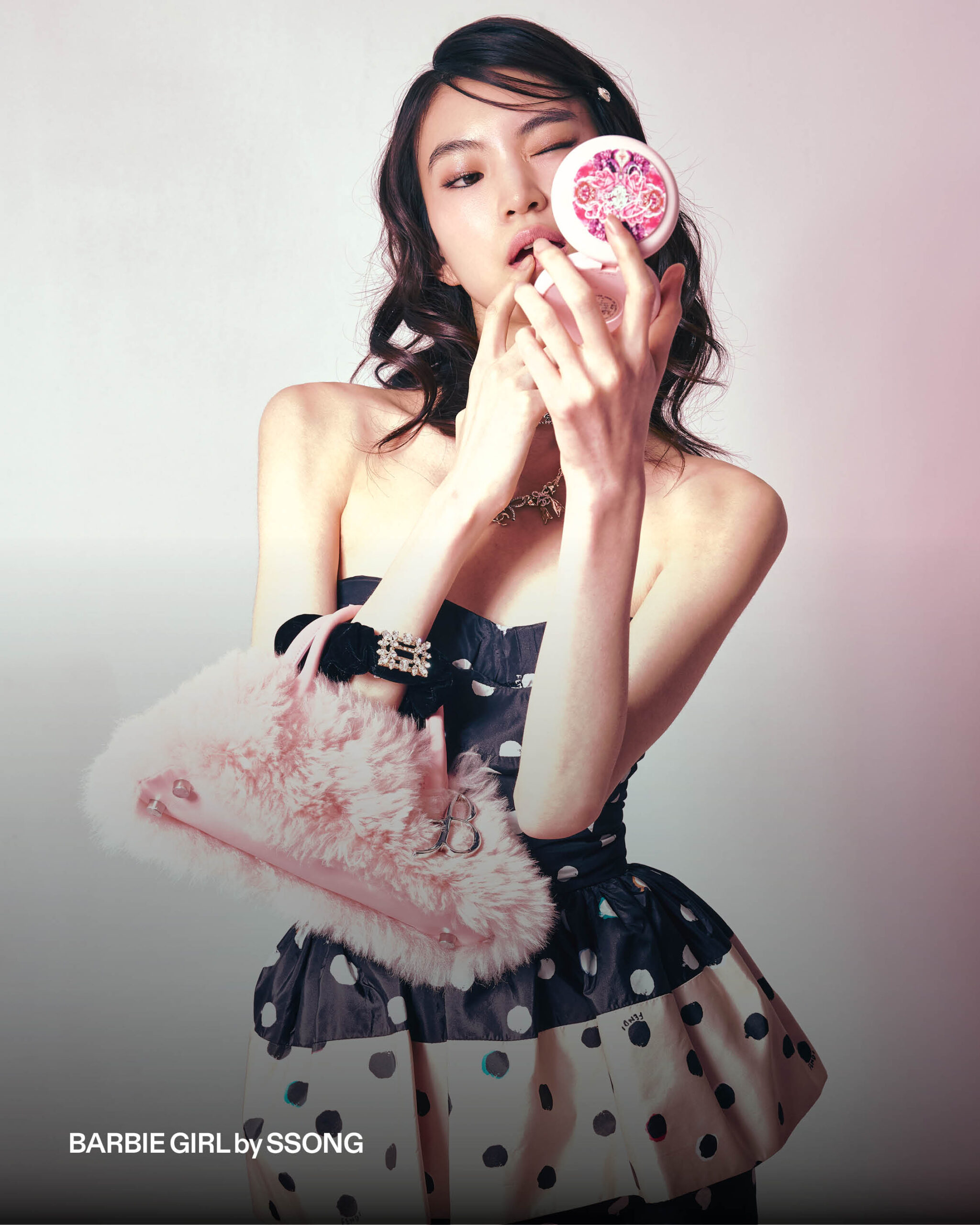 도트 패턴 드레스는 펜디(Fendi), 그린 새틴 하이힐과 손목에 착용한 스크런치는 로저비비에(Roger Vivier), 헤어핀은 비비안 웨스트우드(Vivienne Westwood), 초커와 퍼 핸드백은 블루마린(Blumarine), 리본 참을 장식한 네크리스는 샤넬(Chanel), 타이츠는 에디터의 것.