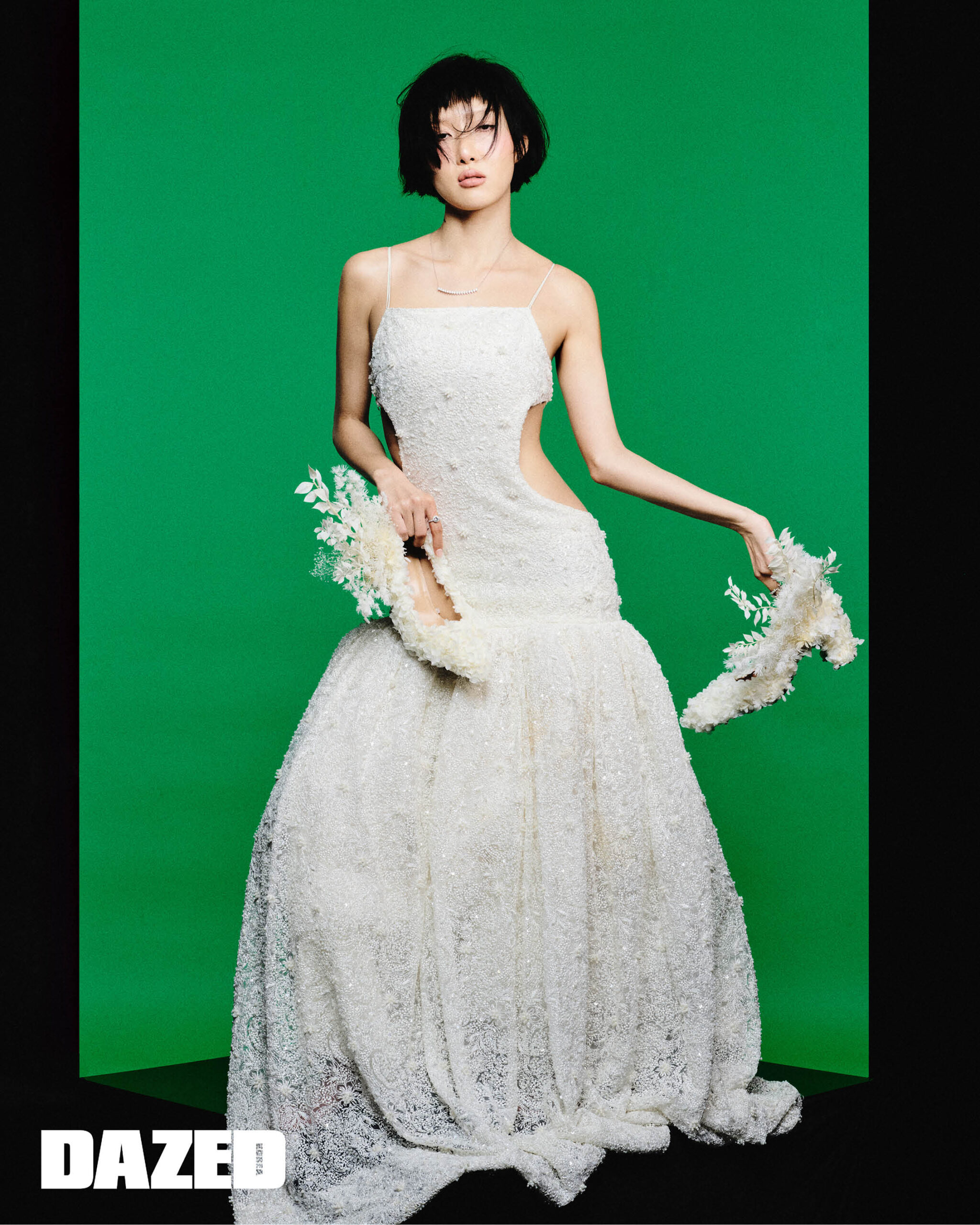 컷아웃 디테일의 드롭 웨이스트 볼륨 드레스는 로크(Rokh), 플라워 장식의 화이트 슈즈는 시즌스(Seasons),18K 화이트 골드에 다이아몬드를 세팅한 데인저 네크리스와 플래티넘에 라운드 브릴리언트 컷 다이아몬드를 세팅한 링은 타사키(Tasaki).