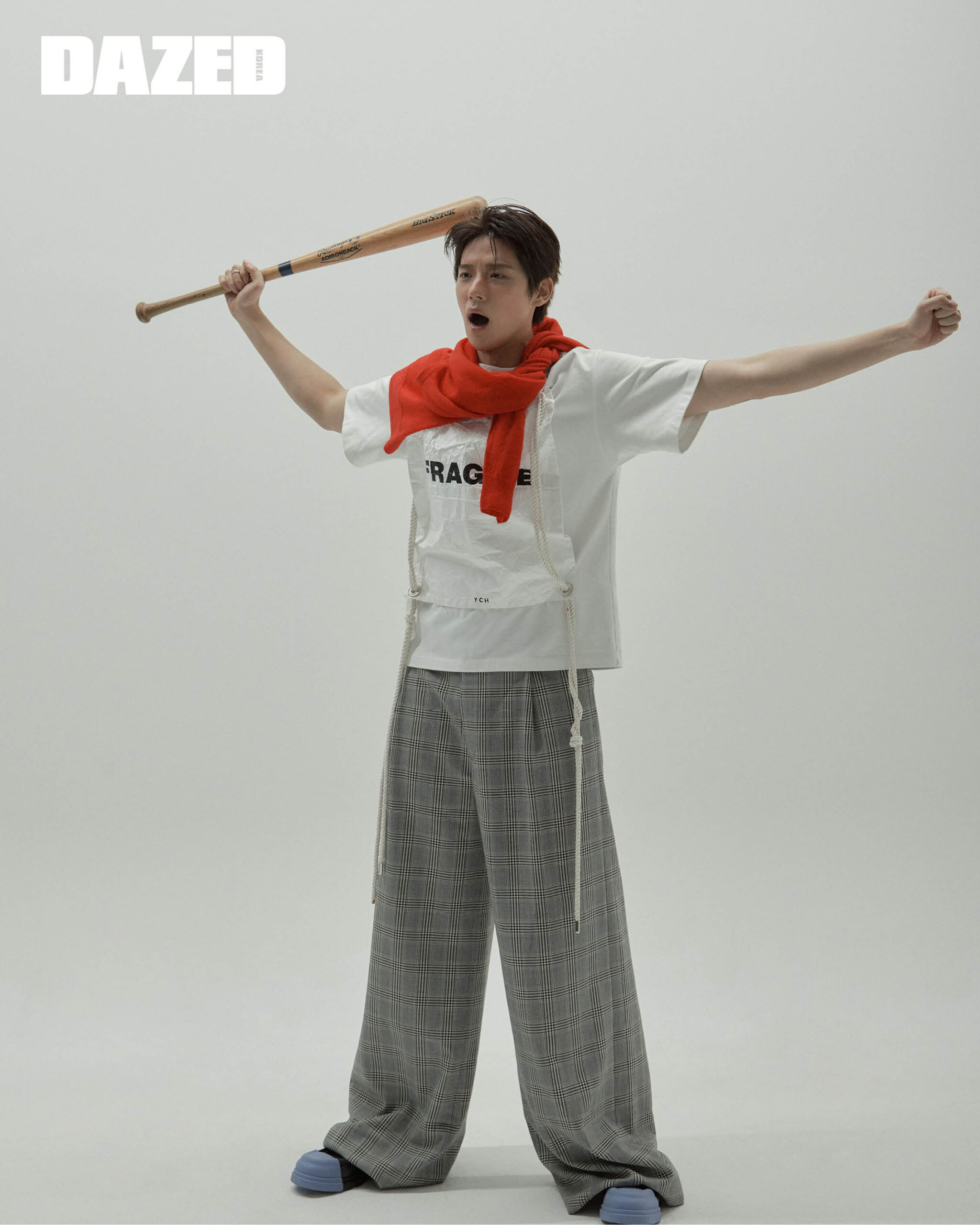 티셔츠는 와이씨에이치(YCH), 체크 팬츠는 코치(Coach), 슈즈는 캠퍼(CAMPER), 머플러로 연출한 레드 니트는 렉토(Recto), 링은 쉬프트앤(SHIFT&).