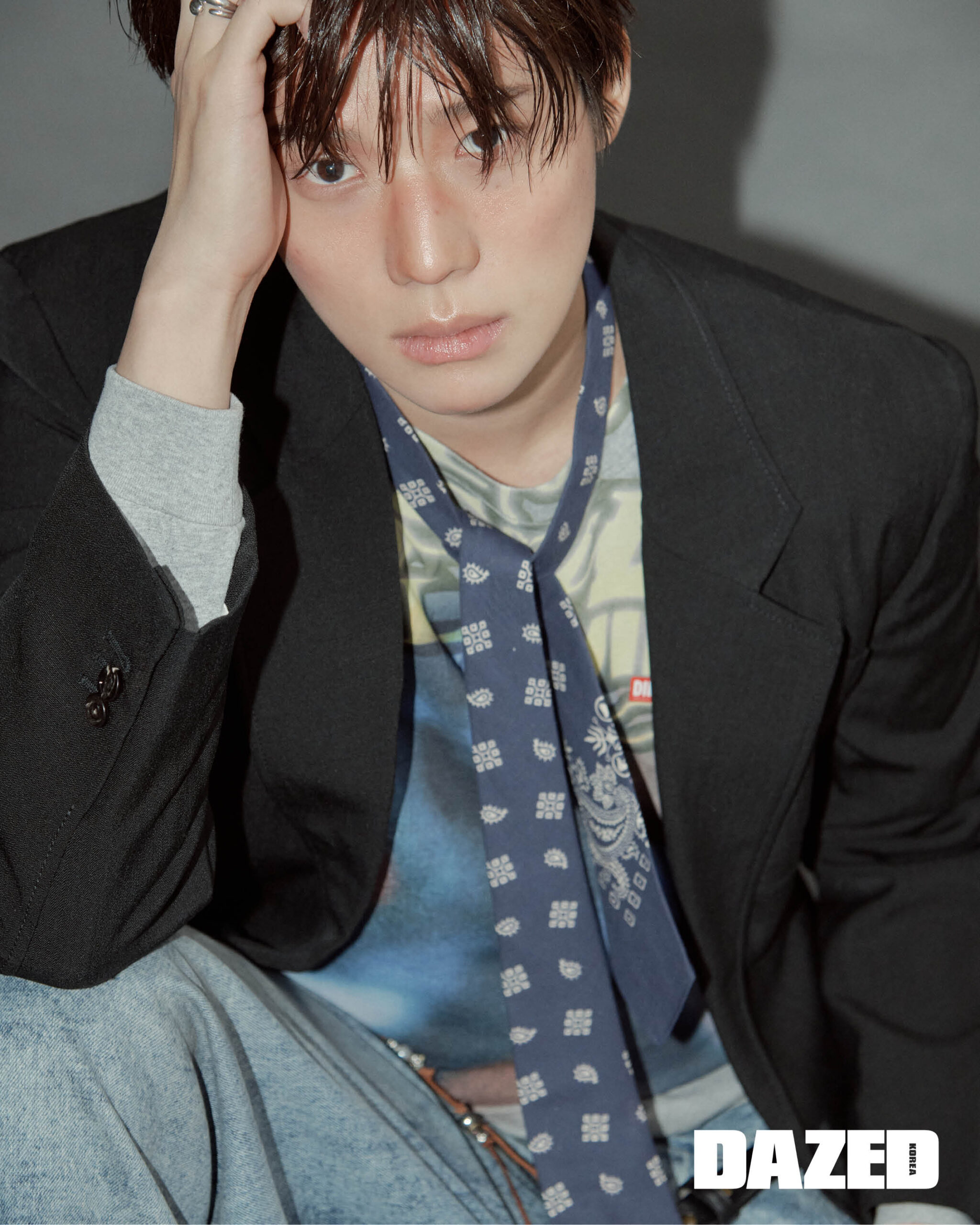 프린트 티셔츠와 데님 팬츠는 디젤(Diesel), 키링으로 연출한 네크리스는 레인세인(P:ReinSein), 링은 쉬프트앤(SHIFT&), 재킷과 타이, 벨트는 모두 스타일리스트의 것.
