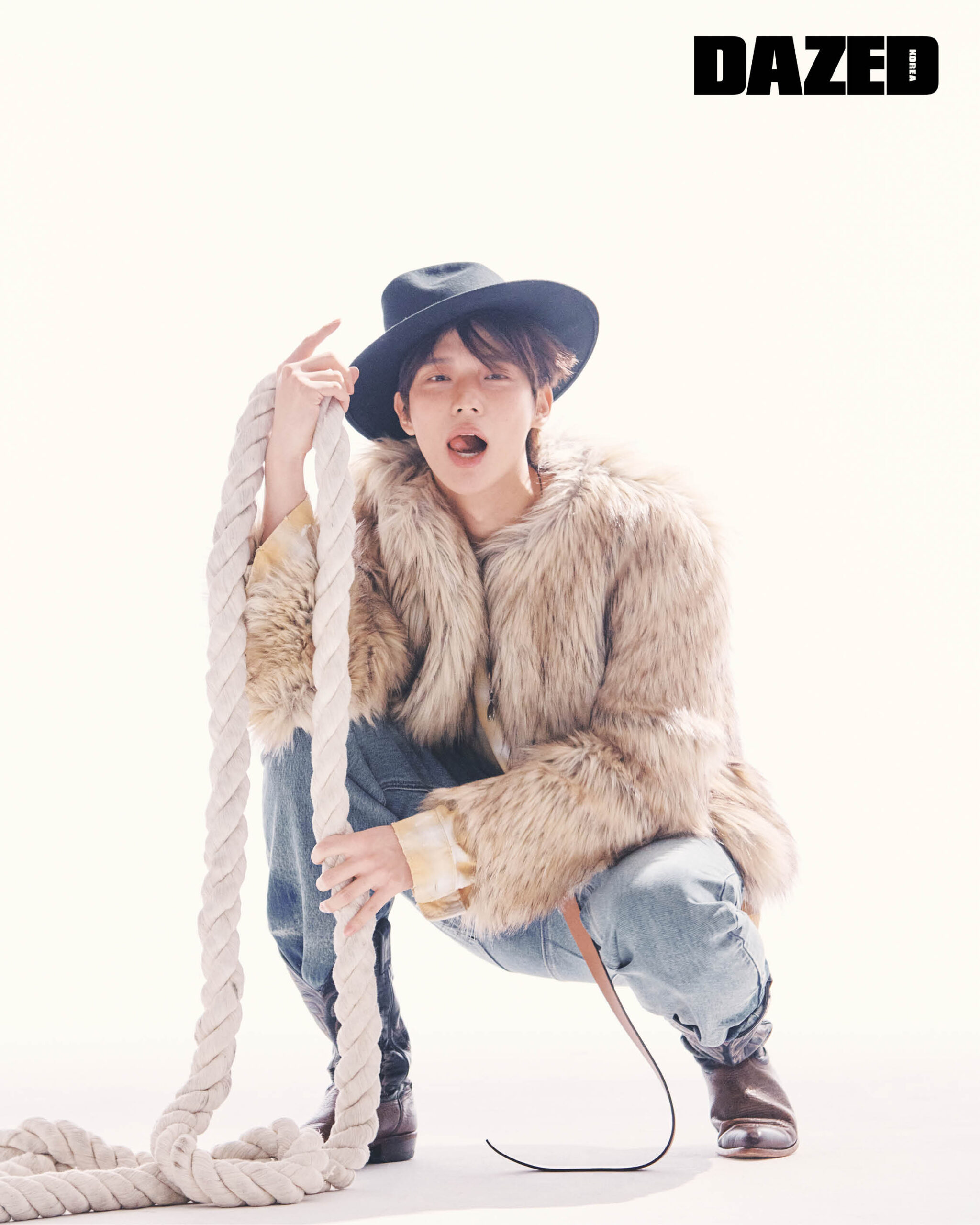 퍼 재킷은 무라(Murra), 옐로 체크 셔츠는 홈리스(Hommless), 데님 팬츠는 앤더슨벨(Andersson Bell), 페도라는 브라운햇(Brown Hat), 로프 네크리스는 레인세인(P:ReinSein), 롱 드롭 벨트는 코치(Coach), 부츠는 스타일리스트의 것.