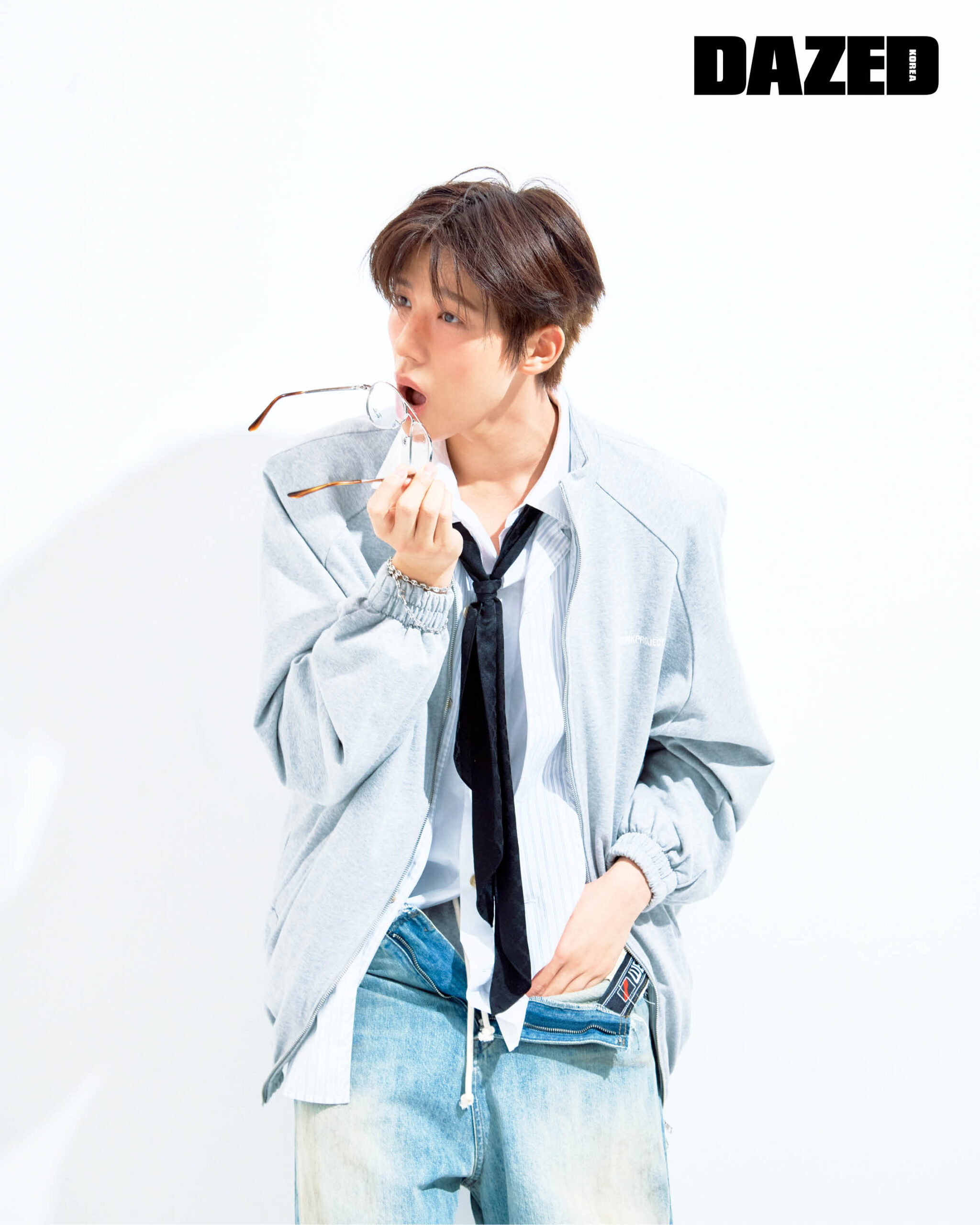 그레이 스웨트 집업 재킷은 트렁크프로젝트(Trunkproject), 레이어드 셔츠는 앤더슨벨(Andersson Bell), 팬츠는 웰던(We11done), 아이웨어는 레이밴 by 에실로룩소티카(Ray-Ban by EssilorLuksottica), 브레이슬릿은 루시류(Lucie-Ryu), 스카프는 스타일리스트의 것.