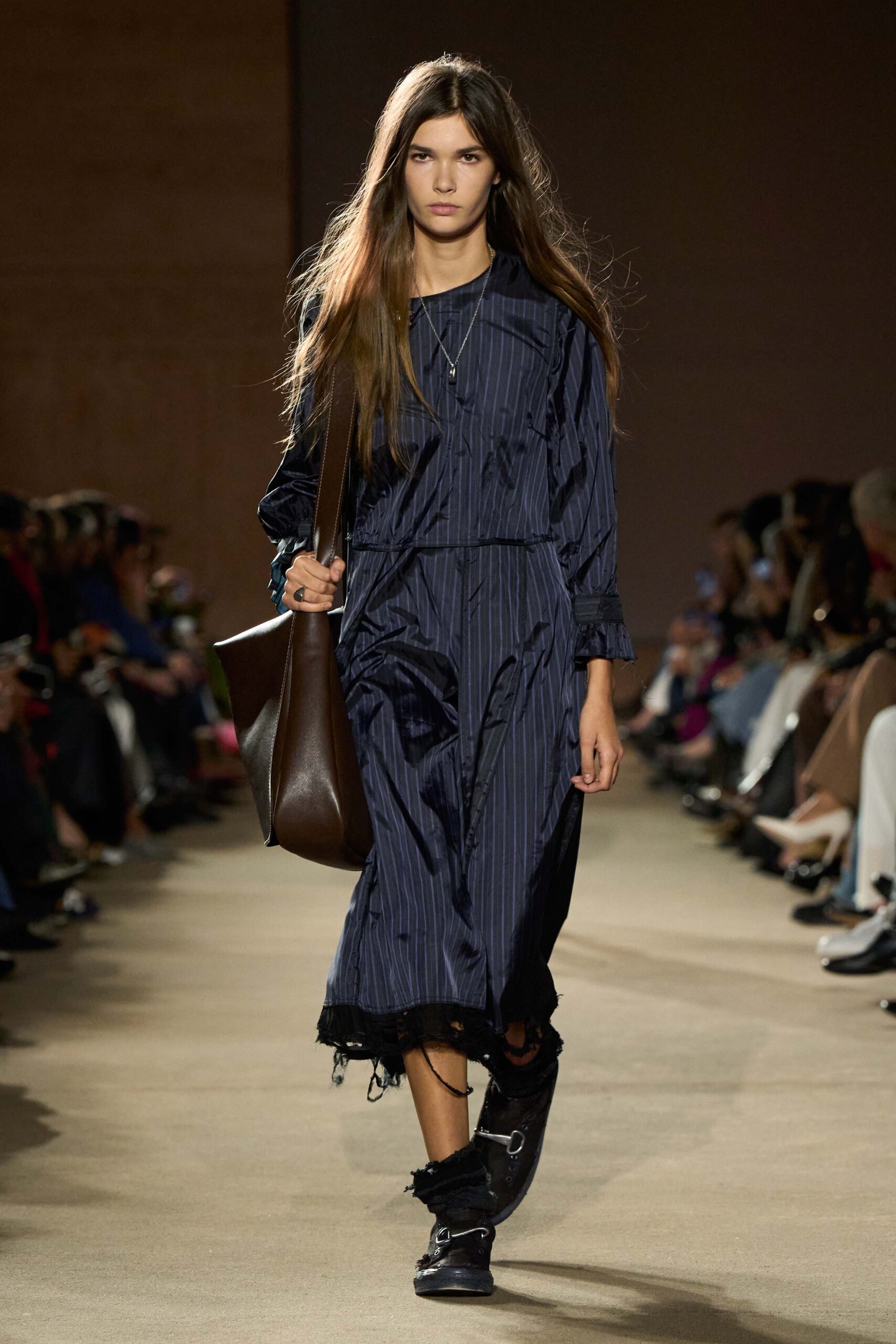 어느 별에서 왔니. 코치의 2026년 가을/겨울 컬렉션은 마치 의 전환 장면처럼 움직인다. 룩 곳곳엔 ‘별’이 떠 있고, 레드와 화이트, 블루 톤이 다양한 색감과 소재로 펼쳐진다. 뒤집힌 테일러드 재킷, 레더 베이스볼 글러브, 패치워크 데님, 하이웨이스트 체크 스커트까지. 낡은 것은 처음처럼 복원되지 않는다. 대신 해체되고, 드러나며, 다시 조립된다. 크리에이티브 디렉터 스튜어트 베버스에게 빈티지는 완결된 과거가 아니라 ‘질문 가능한 현재’다. 그는 얼룩이나 찢어진 자국이 거의 사랑의 메모와도 같다는 사실을 깨달았다고 전했다. “가족은 우리가 처음으로 사랑을 배우는 곳이에요. Family is where we first learn to love.” 의 대사 한 문장이 딱, 떠오르는 무대. 그리고 아홉 살 딸, 폰fawn에게 사랑 가득한 이 쇼를 바친다고.