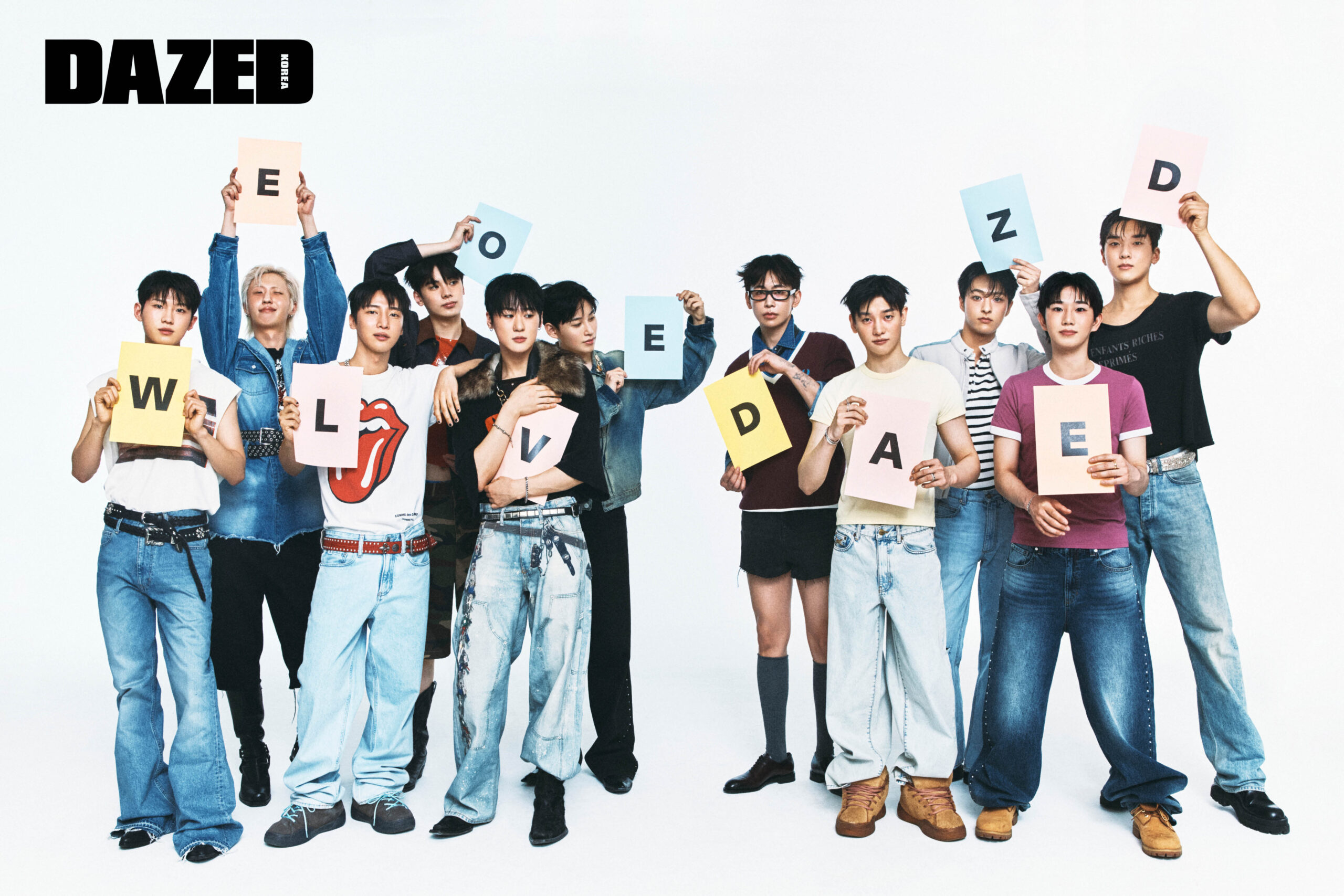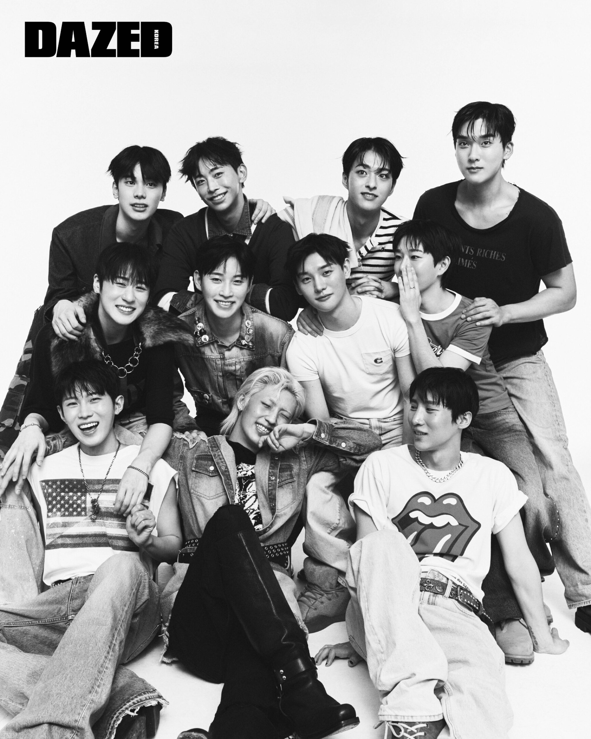 선욱이 입은 슬리브리스 톱과 팬츠, 슈즈, 벨트는 모두 에디터의 것. 음혁진이 입은 데님 재킷은 에잇아이지비 by 모스(8IGB by MOTH), 니트 톱은 비어브로(Beerbro), 이어링은 음혁진의 것, 쇼츠와 부츠, 벨트는 모두 에디터의 것. 재하가 입은 데님 팬츠는 캘빈클라인 진(Calvin Klein Jeans), 티셔츠와 슈즈, 네크리스, 벨트는 모두 에디터의 것. 타이치가 입은 데님 재킷은 포츠 인터내셔널(Ports International), 카고 쇼츠는 오드스튜디오(Oddstudio), 탱크톱과 부츠는 에디터의 것. 이혁진이 입은 티셔츠는 이알엘(ERL), 데님 팬츠는 그레일즈(Grailz), 이어링은 이혁진의 것, 부츠와 퍼 디테일 네크리스, 브레이슬릿, 벨트는 모두 에디터의 것 민성이 입은 데님 팬츠는 게스(Guess), 배지 디테일 데님 재킷과 슈즈는 에디터의 것. 수민이 입은 브이넥 스웨터는 프레드 페리(Fred Perry), 데님 셔츠는 (Lee), 쇼츠와 더비 슈즈, 아이웨어, 타이, 니삭스는 모두 에디터의 것. 형준이 입은 티셔츠와 데님 팬츠는 코치(Coach), 브레이슬릿과 링은 형준의 것, 부츠는 에디터의 것. 한결이 입은 데님 재킷은 아크네 스튜디오(Acne Studios), 스트라이프 티셔츠는 노이스(Noice), 데님 팬츠와 부츠는 에디터의 것. 윤재가 입은 티셔츠는 엔비에이(NBA), 데님 팬츠는 게스(Guess), 부츠는 팀버랜드(Timberland), 링은 윤재의 것, 브레이슬릿은 에디터의 것. 현준이 입은 티셔츠와 데님 팬츠, 부츠, 벨트는 모두 에디터의 것.