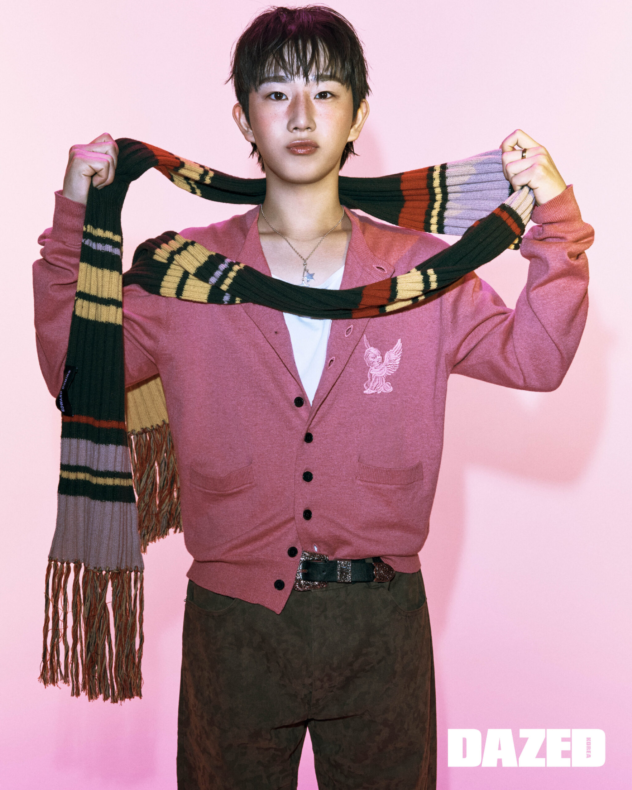 핑크 카디건은 마수 by 모스(Masu by MOTH), 머플러는 에드워드 커밍 by 모스(Edward Cumming by MOTH), 네크리스는 세르주 토라발(Serge Thoraval), 링은 윤재의 것, 티셔츠와 팬츠, 벨트는 모두 에디터의 것.