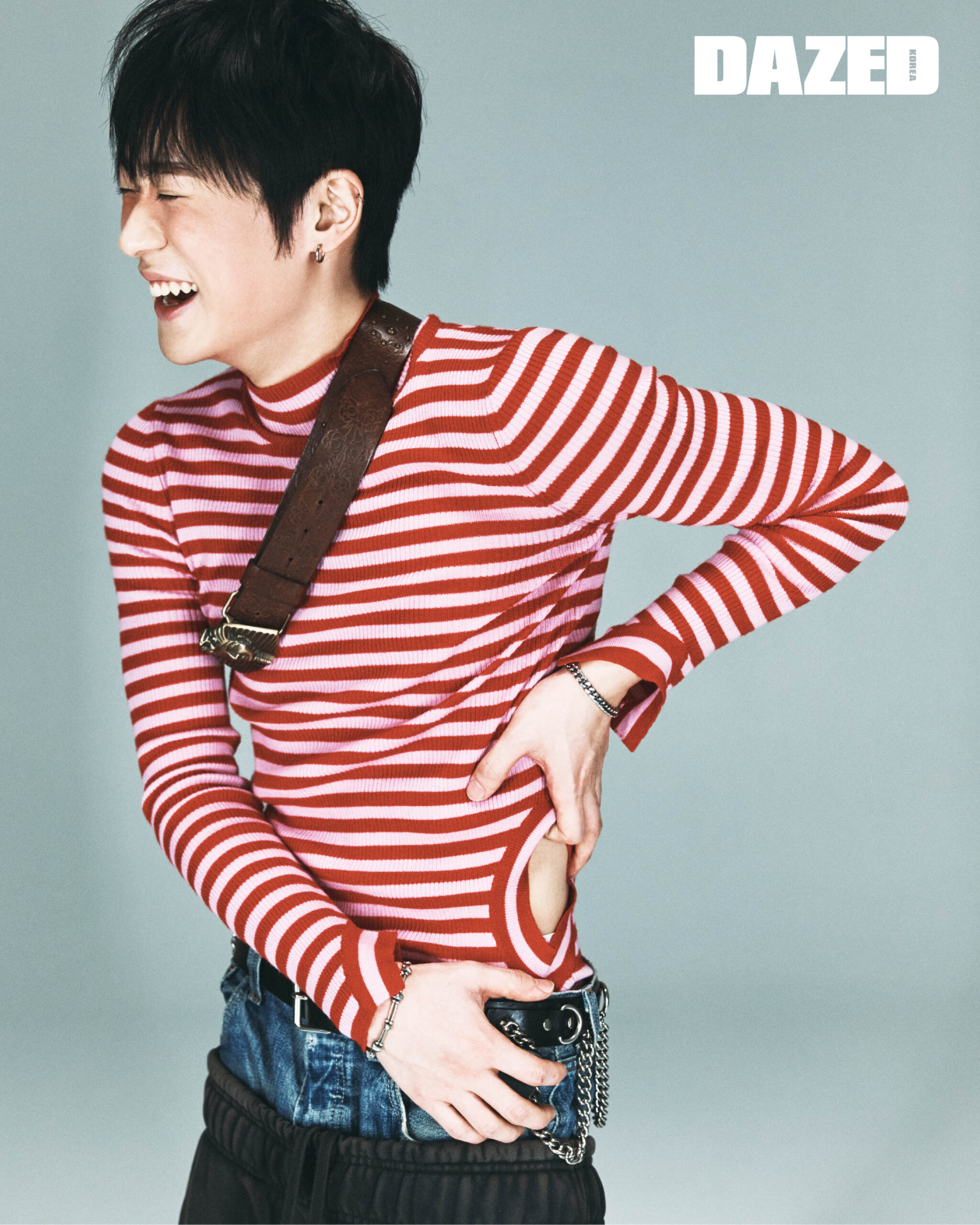 스트라이프 니트 톱은 엔폴드(Enfold), 브리프와 이어링은 이혁진의 것, 스웨트팬츠와 데님 팬츠, 체인 디테일 벨트, 어깨에 두른 벨트는 모두 에디터의 것.