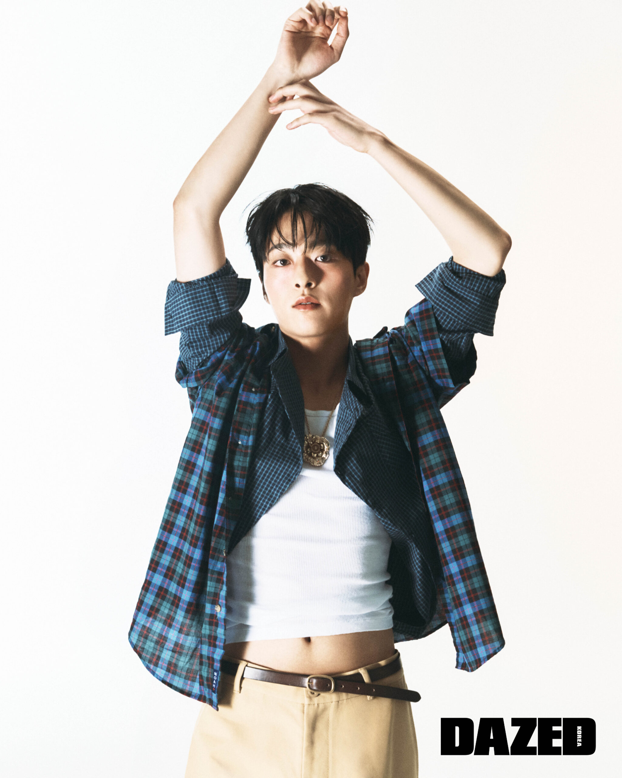 체크 하프 셔츠는 노아(Noah), 레이어드한 체크 셔츠는 오드스튜디(Oddstudio), 베이지 팬츠는 아크네 스튜디오(Acne Studios), 탱크톱과 네크리스, 벨트는 모두 에디터의 것.