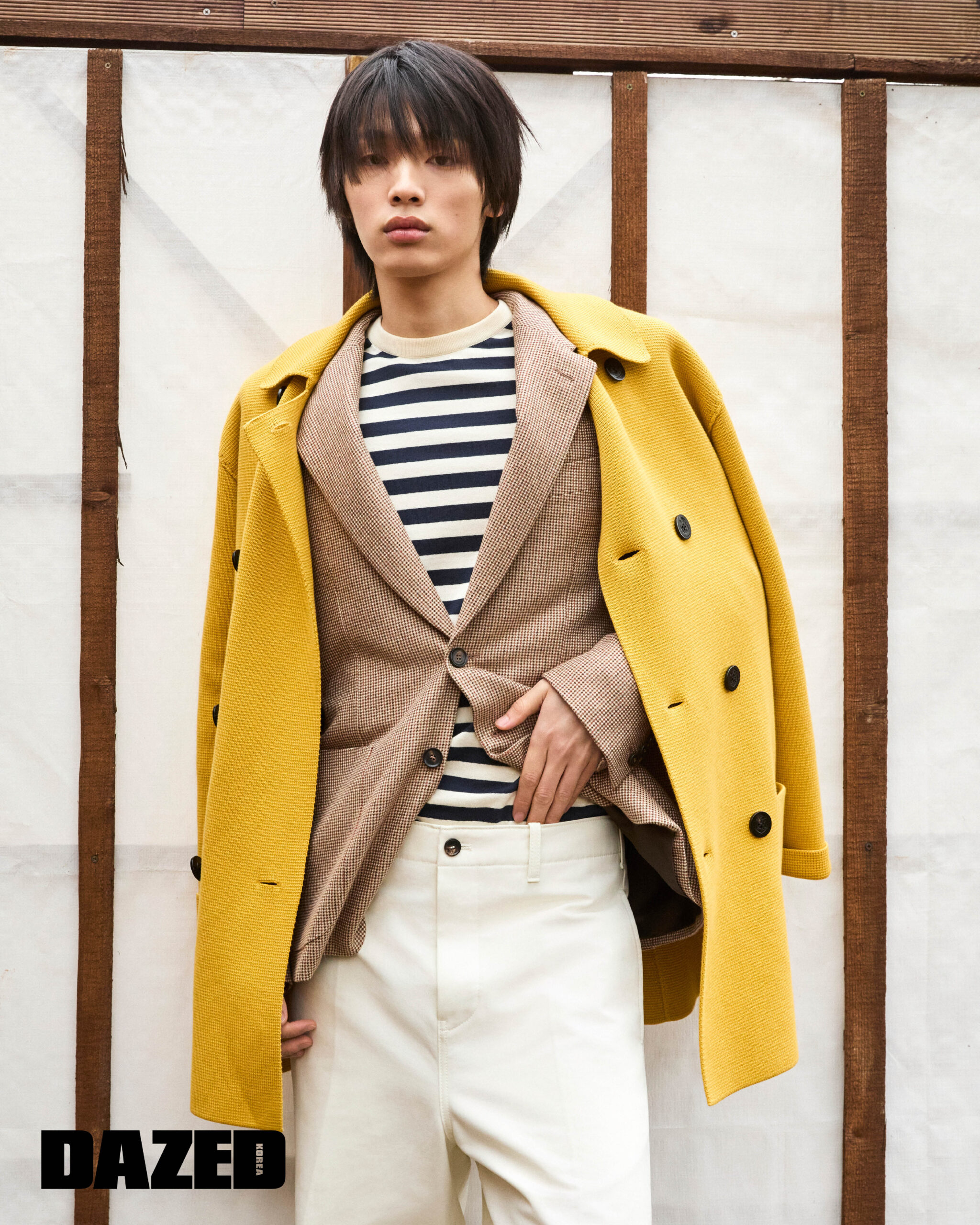 옐로 컬러의 코튼 재킷과 실크 블레이저, 스트라이프 티셔츠, 트라우저는 모두 로로피아나(Loro Piana).