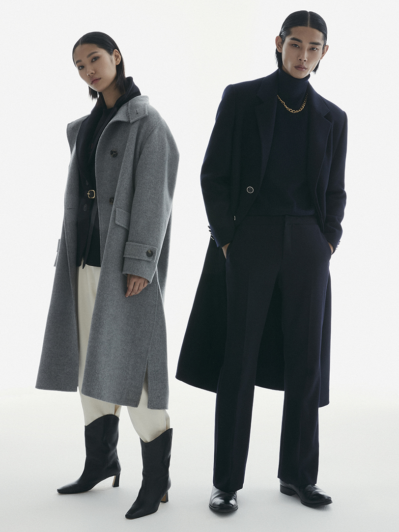 서머 울 블렌디드 세미 오버핏 재킷과 슬리브리스 볼륨 롱 드레스, 허리에 묶은 시그너처 서머 니트 카디건은 모두 구호플러스(kuho plus).